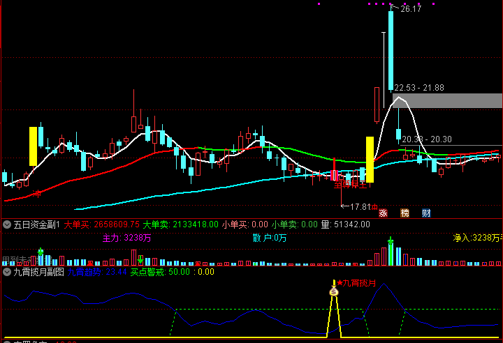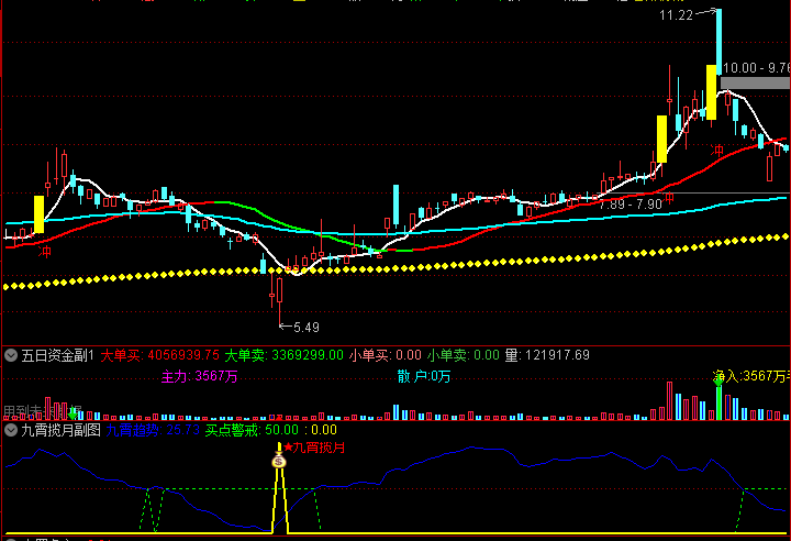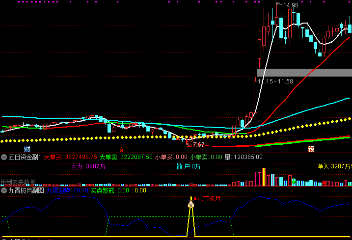2.副图中的黄色箭头表示九霄揽月信号,也是买点信号,代表价格波动率极低时的超卖临界值。