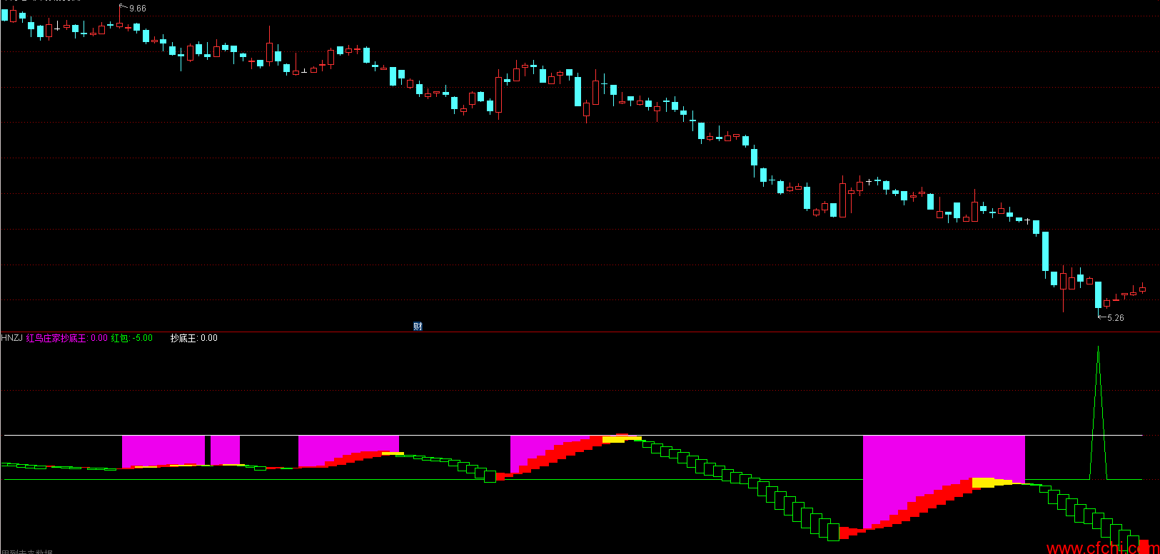 选股1:=-26;抄底:=-40;红鸟庄家抄底王:0,COLORFF00FF,POINTDOT;