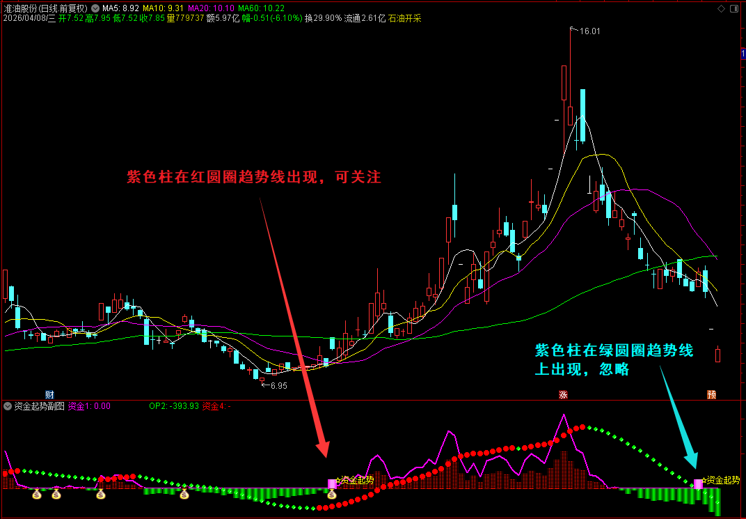 紫色柱在红圆圈趋势线出现,可关注