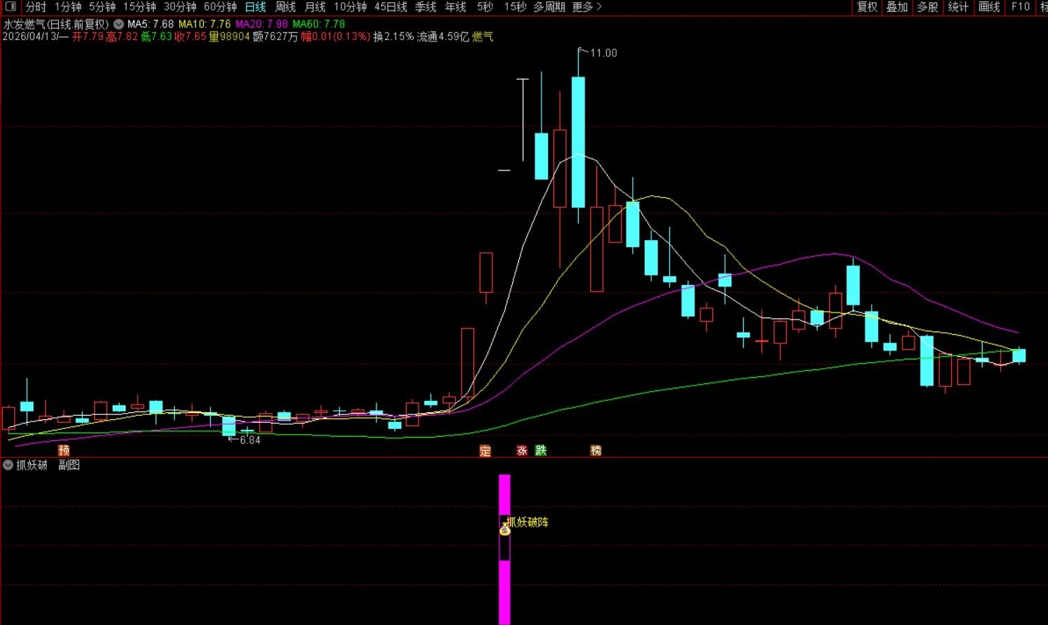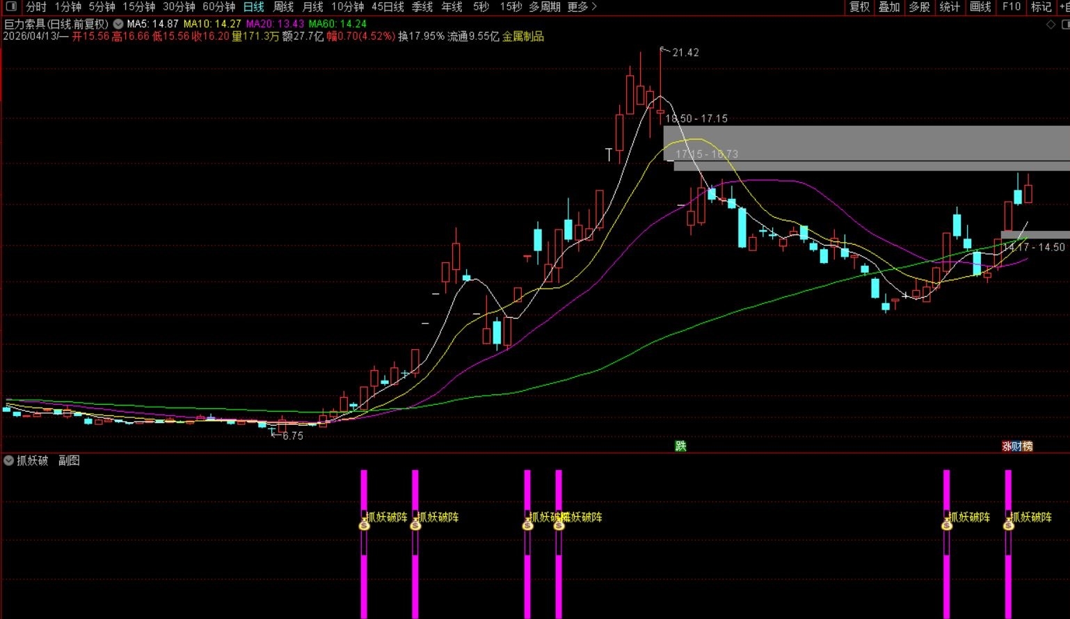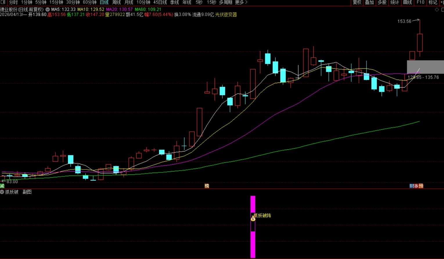 操作策略:当图表上出现“抓妖破阵”的文字和图标信号时,表明一只强势股在涨停后,以更大的成交量突破了之前的阻力位,这是一个强烈的短线追涨信号,预示着股价可能进入快速拉升阶段。