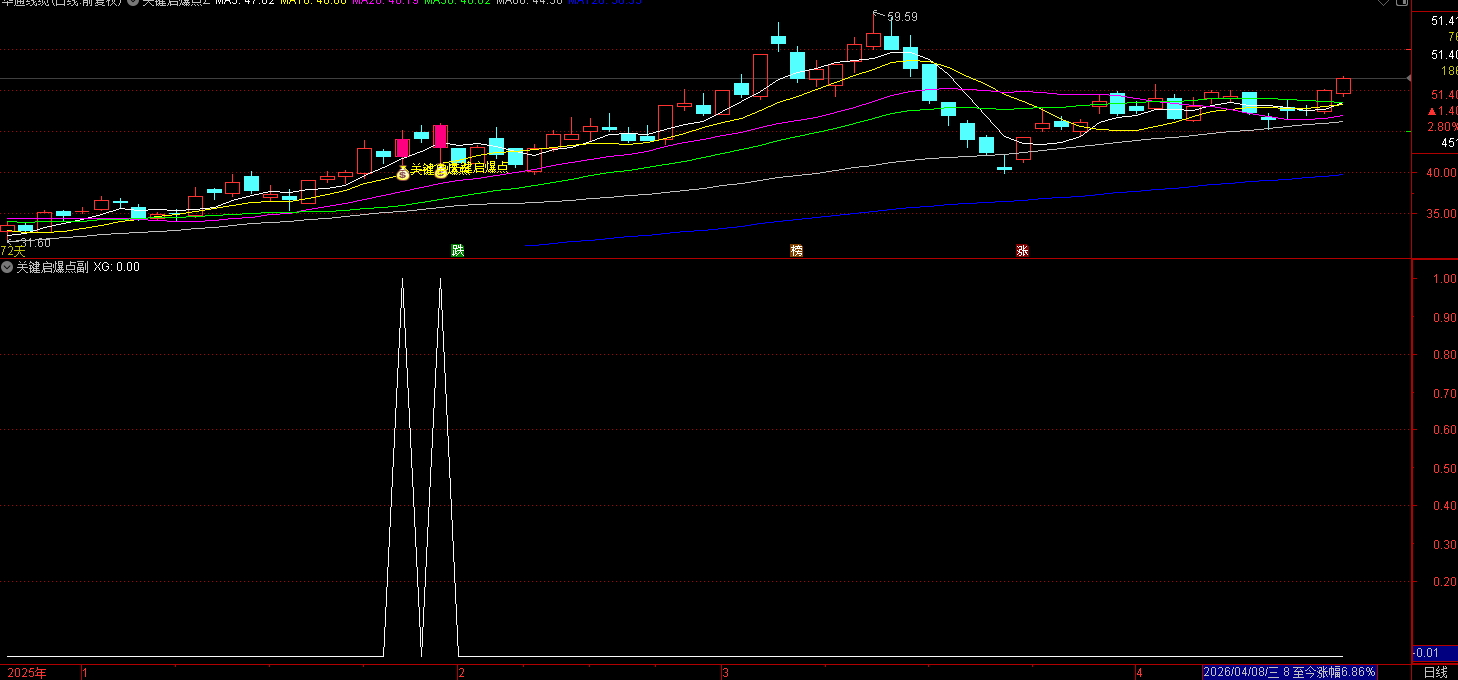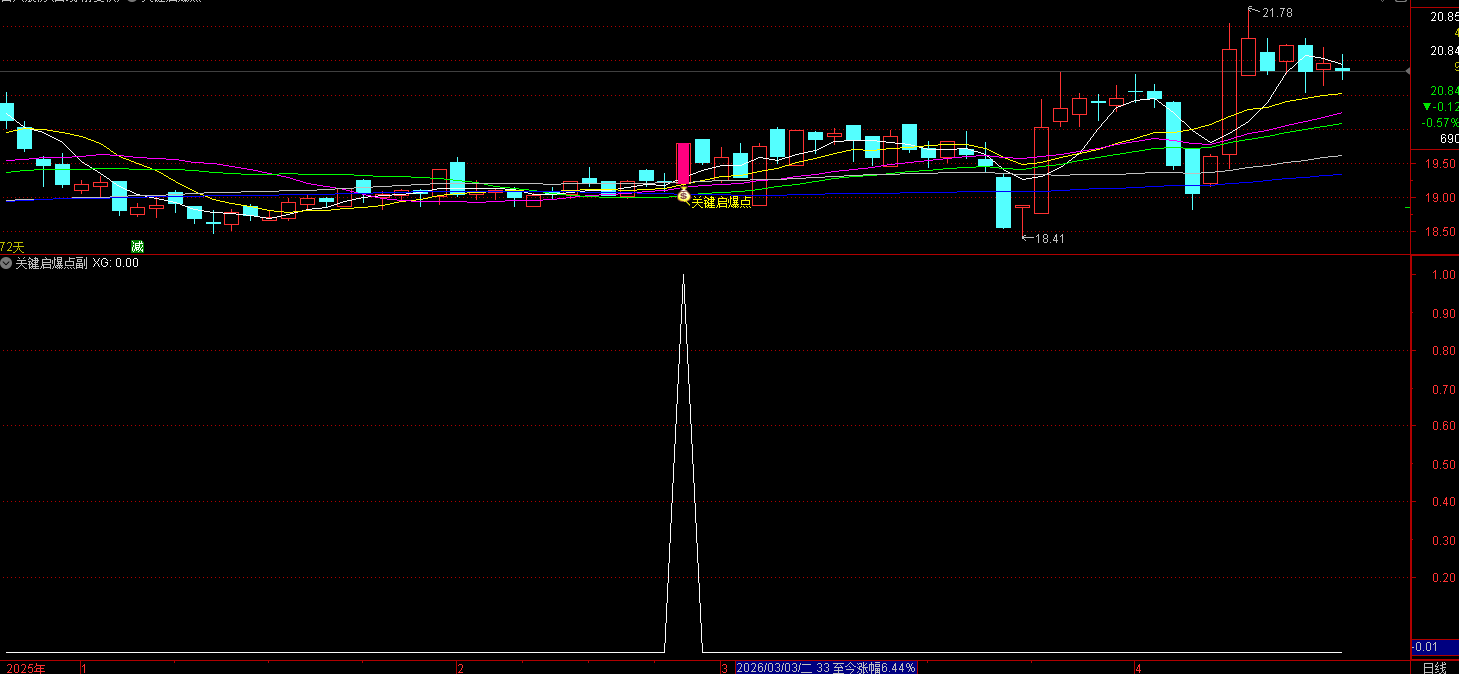 操作策略上,当指标发出信号时,意味着一个潜在的买入机会。这通常发生在上升趋势的回调结束后,上涨动能重新聚集并加速释放的时刻。使用者可以将其作为一个预警信号,结合成交量等其他因素进行综合判断,寻找合适的介入点。
