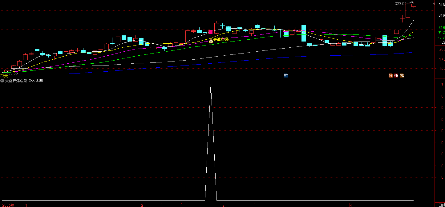指标是一个用于捕捉股价启动点的选股工具,它结合了均线系统和MACD指标的动能变化。其核心逻辑是,在股价处于多头排列的上升趋势中,当MACD指标的红柱(上涨动能)突然加速放大,且前一天是阴线、当天涨幅又不过大时,便认为股价即将“起爆”,进入快速拉升阶段。