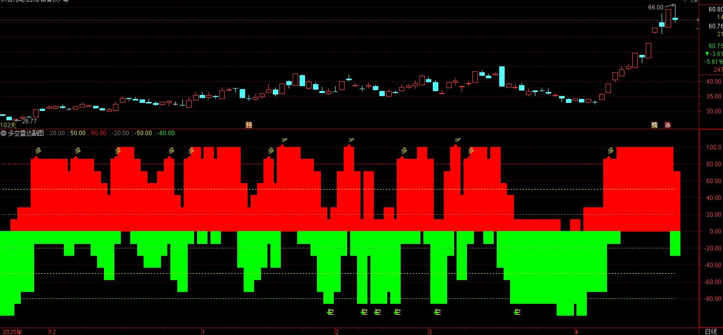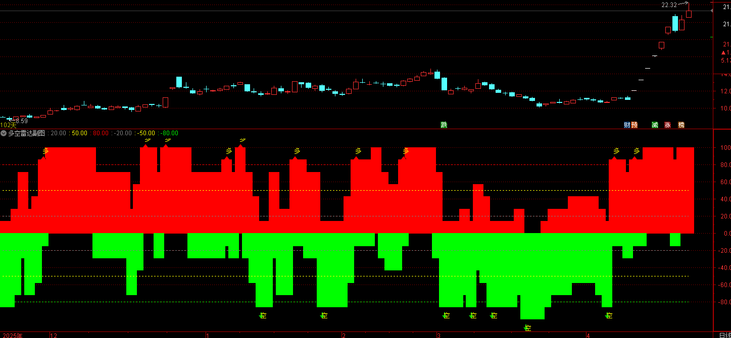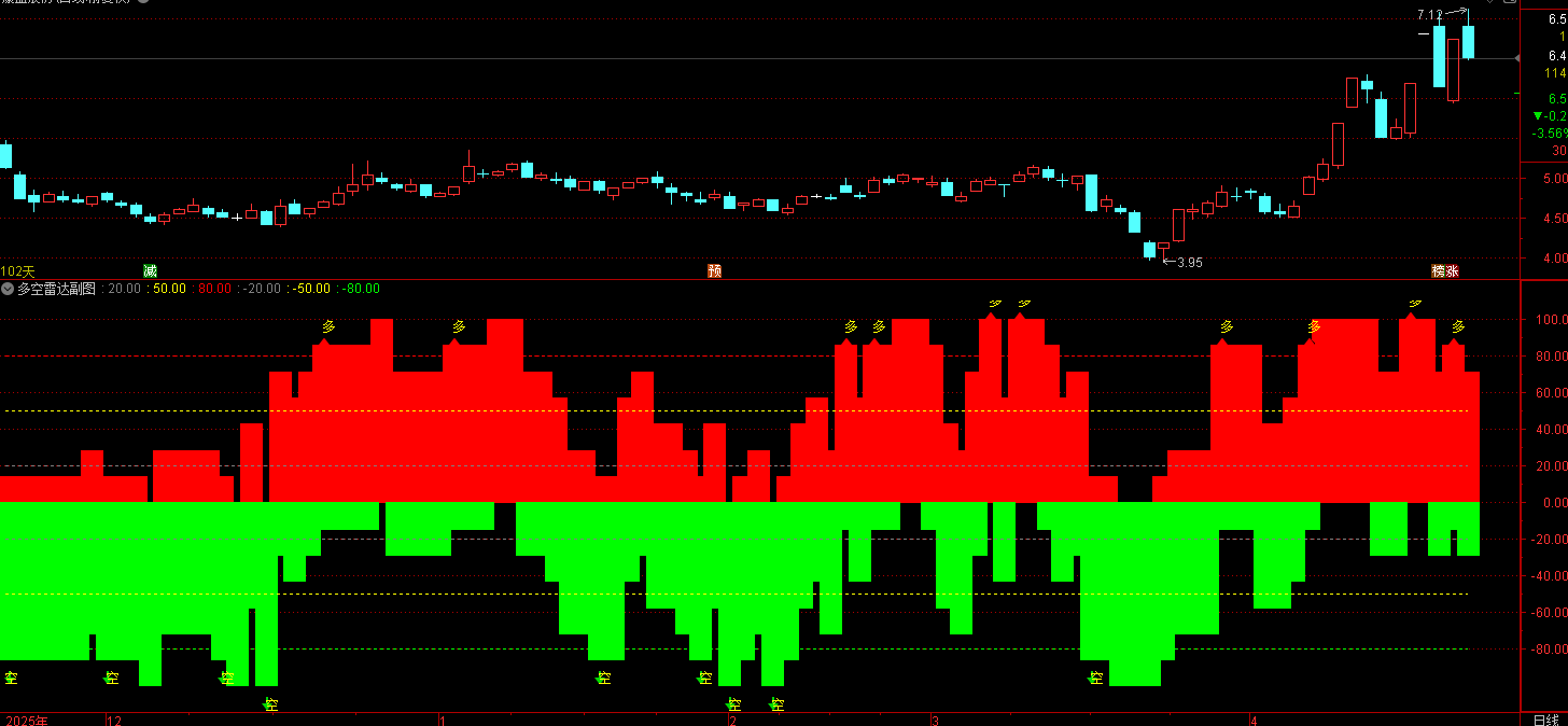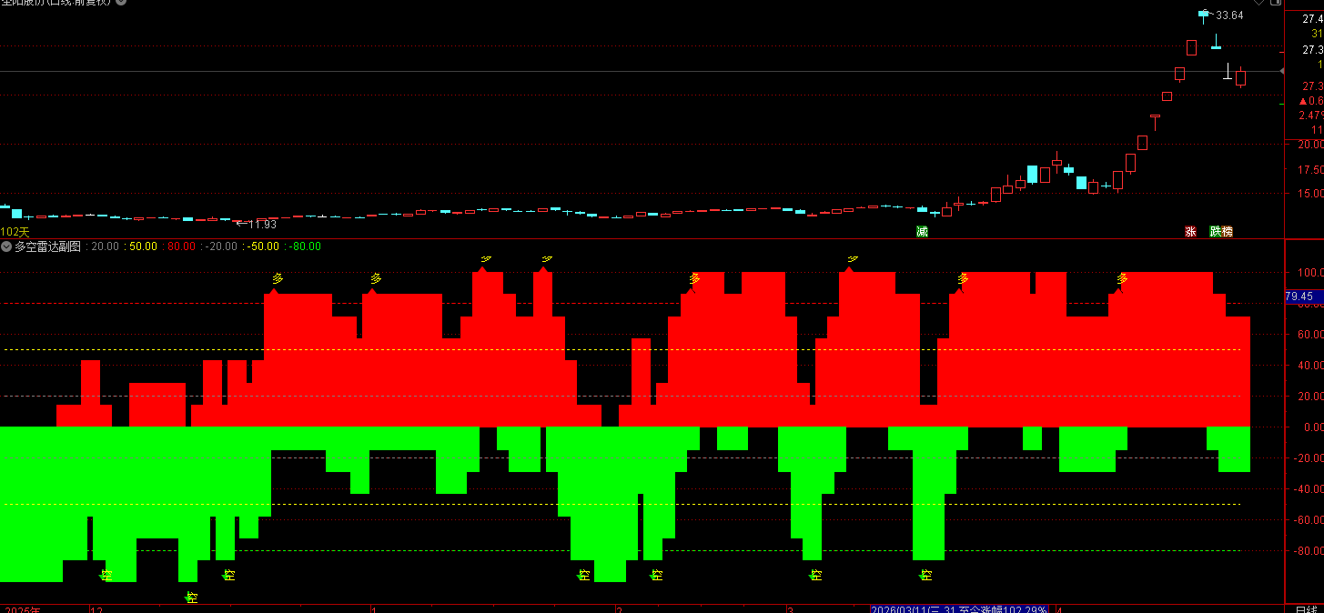(通达信多空雷达指标做多信号(买入参考) - 出现 黄色“多”箭头 - 红柱明显放大并站上)