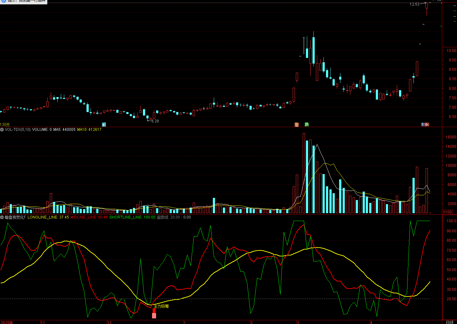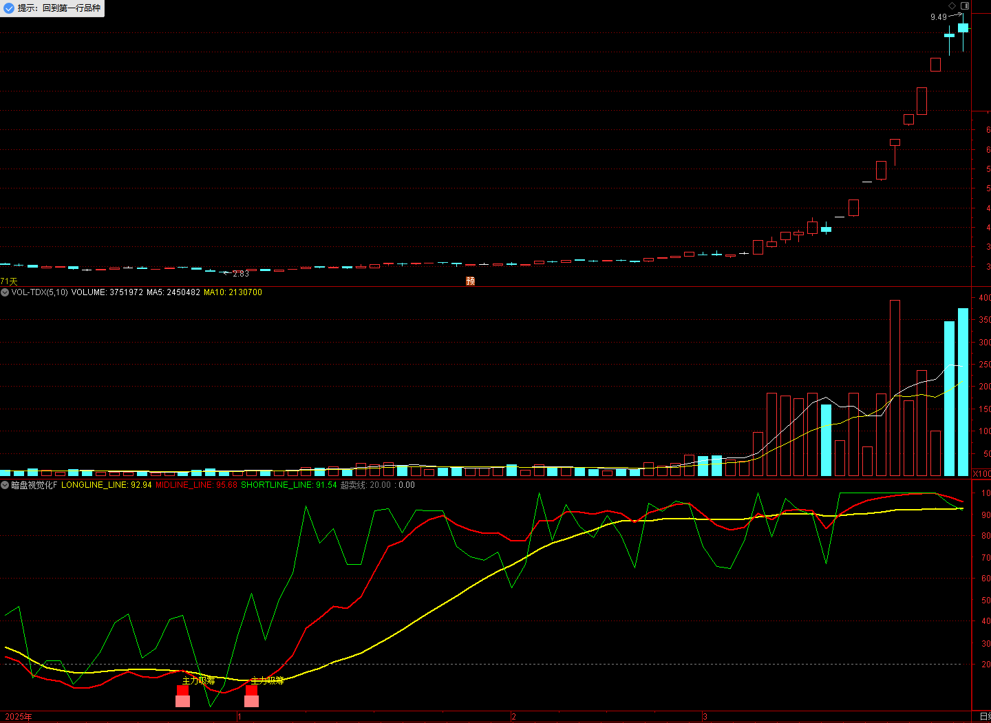 红线 (MIDLINE_LINE):中期资金动向线。此线上穿黄线,代表资金开始回流。
