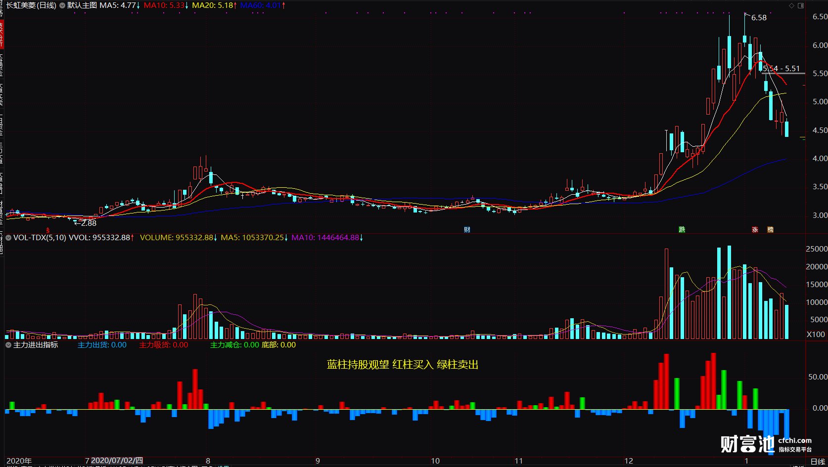 监测主力进出和主力买卖指标用法:看见红色柱子时,是一个预警信号,刚好是位于低位,代表着接下来后面股市会涨,这时我们可以考虑买入股票,看到绿色柱子的提示,我们应该赶紧走人,不冒险追涨 ,蓝色柱子表示主力在出货,时刻要记住这句话——低位买入,高位卖出。