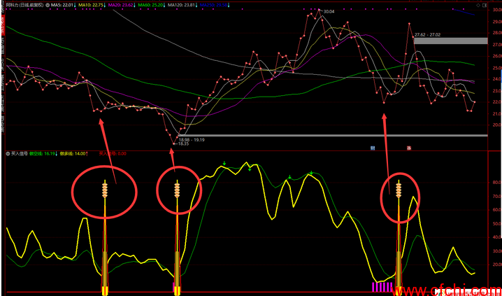 买入信号:IF(CROSS(3*SMA((CLOSE-LLV(LOW,21))/(HHV(HIGH,21)-LLV(LOW,21))*100,5,1)-2*SMA(SMA((CLOSE-LLV(LOW,21))/(HHV(HIGH,21)-LLV(LOW,21))*100,5,1),3,1),10),70,0),COLORRED,LINETHICK2;