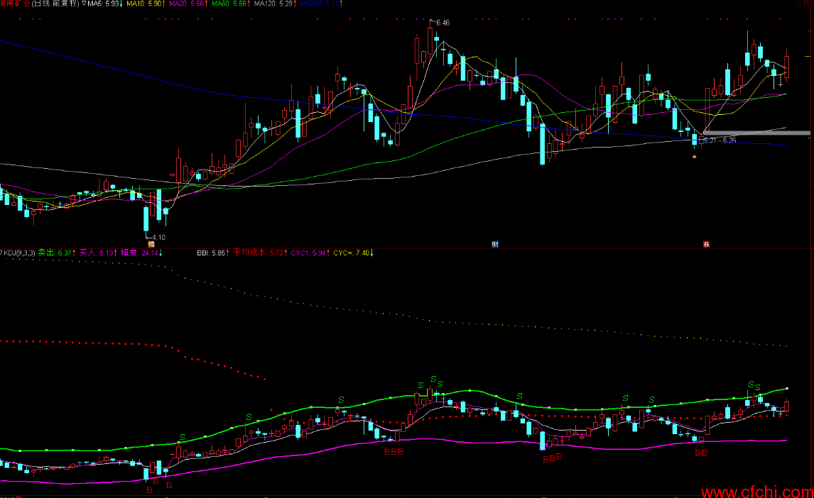 DRAWTEXT(CROSS(C,买入) OR (L<买入),LOW*0.95,'B'),COLORRED,LINETHICK2;