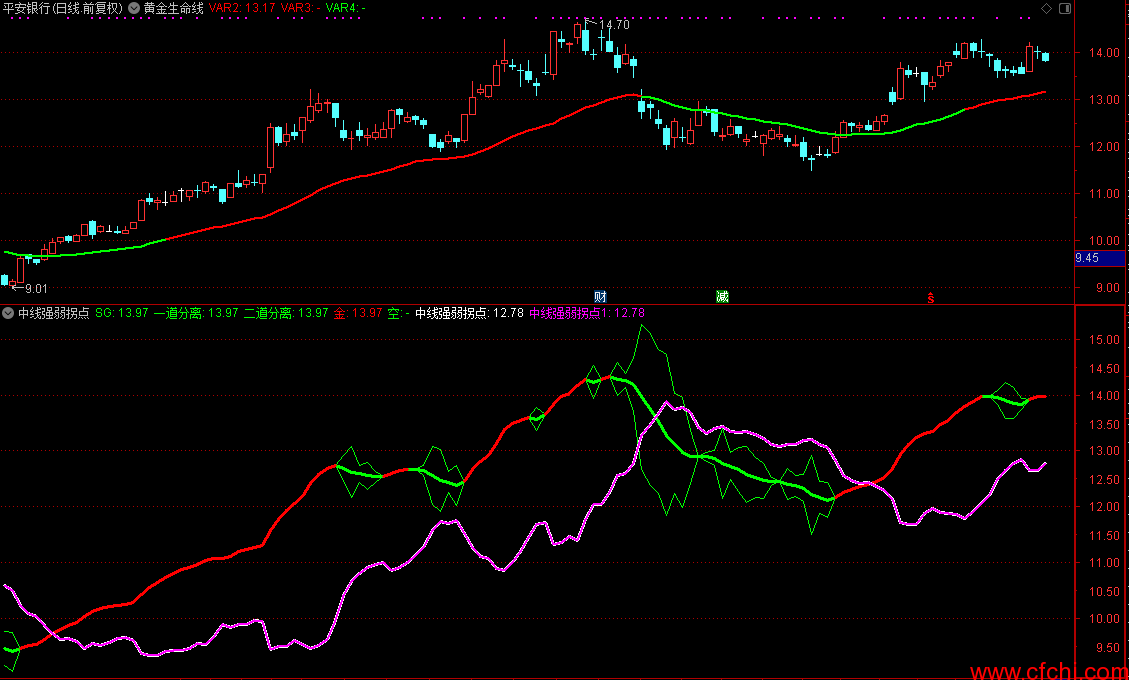 中线强弱拐点:EMA(股道*C/100+基础,3),COLORWHITE,LINETHICK3;