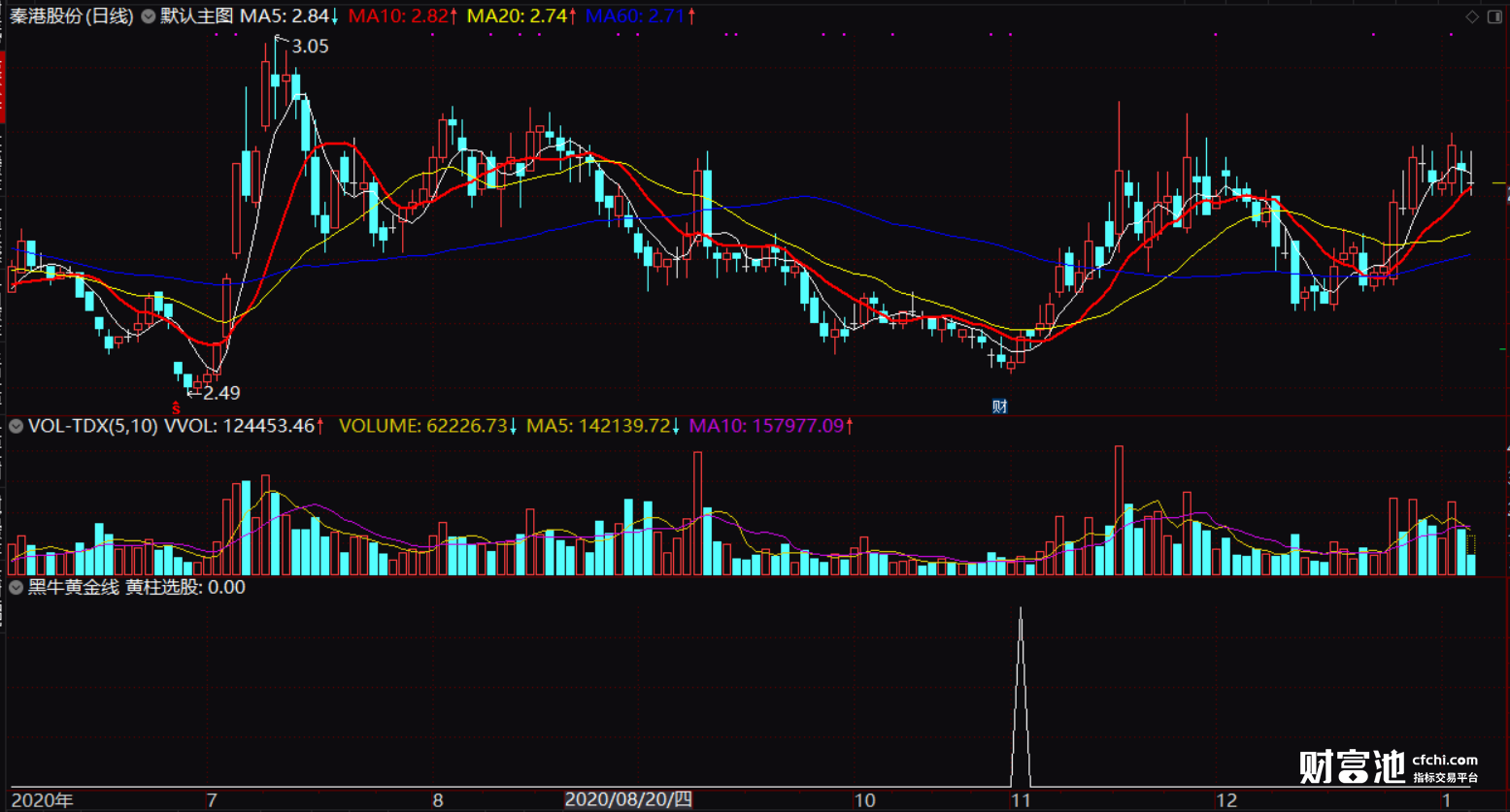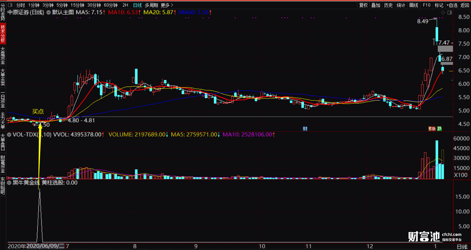图中所示副图指标中,凸起了一个尖尖的线条,这就是短线中线绝佳买入点指标,预示着这个股票上涨的趋势,这个时候买入,可能会赚得更多!