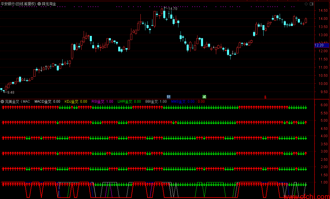 完美金叉(MACD金叉 KDJ金叉 RSI金叉 LWR金叉 BBI金叉 MMS金叉)通达信 选股公式 副图 源码 贴图