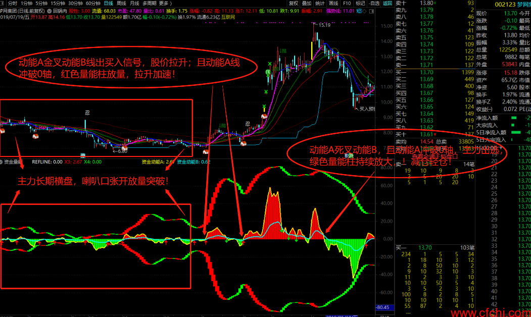 喇叭口收窄且极度缩量的标的开始密切留意,合久必涨!一但的动能A金叉动能B线,标的异动反转;动能A冲上0轴且出现红色量能柱持续放大,股价开启一波拉升旅程。