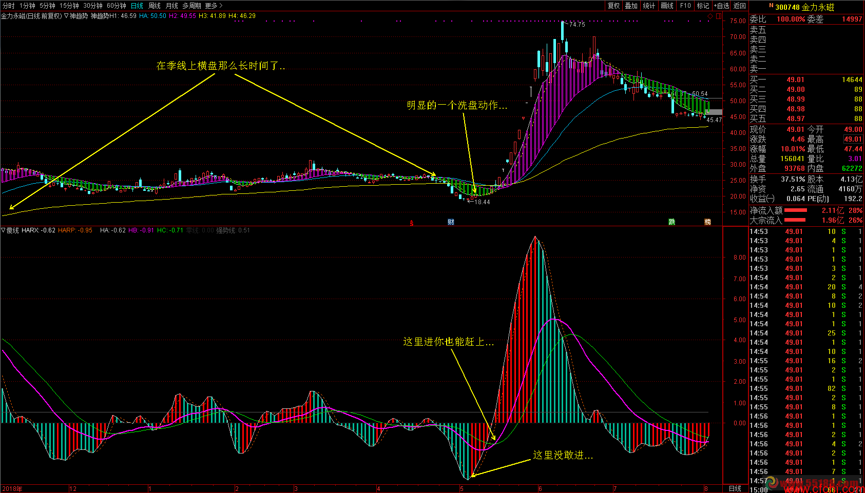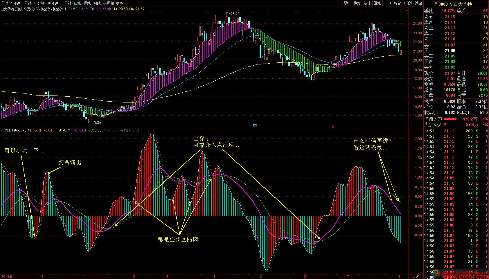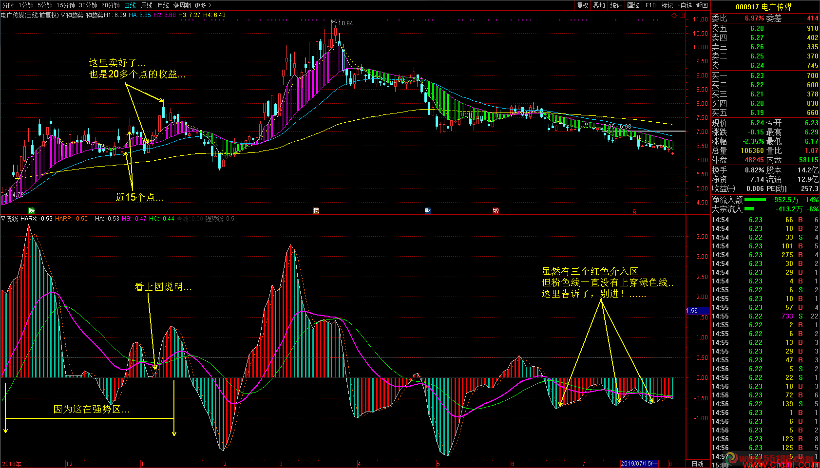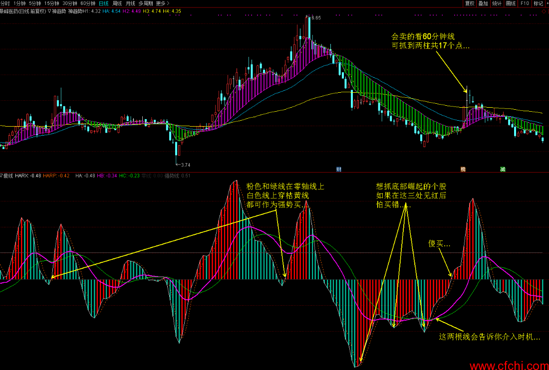筹码穿越顶底,本人原创,在某指标网被评为精华指标,可以用于任何周期,做分时指标也极其有用,本人自用的之一