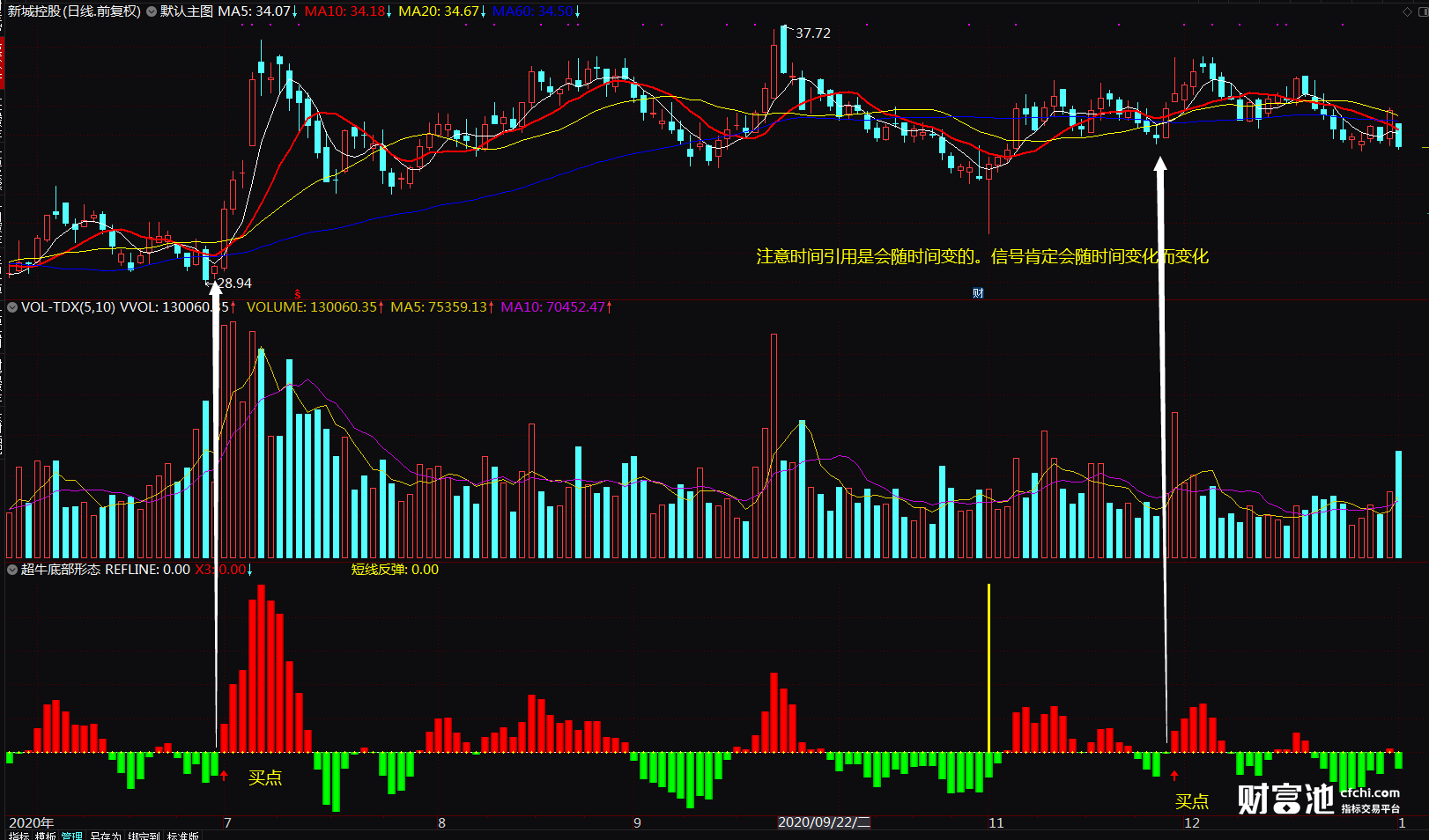 超牛底部形态选股指标有用到时间函数!