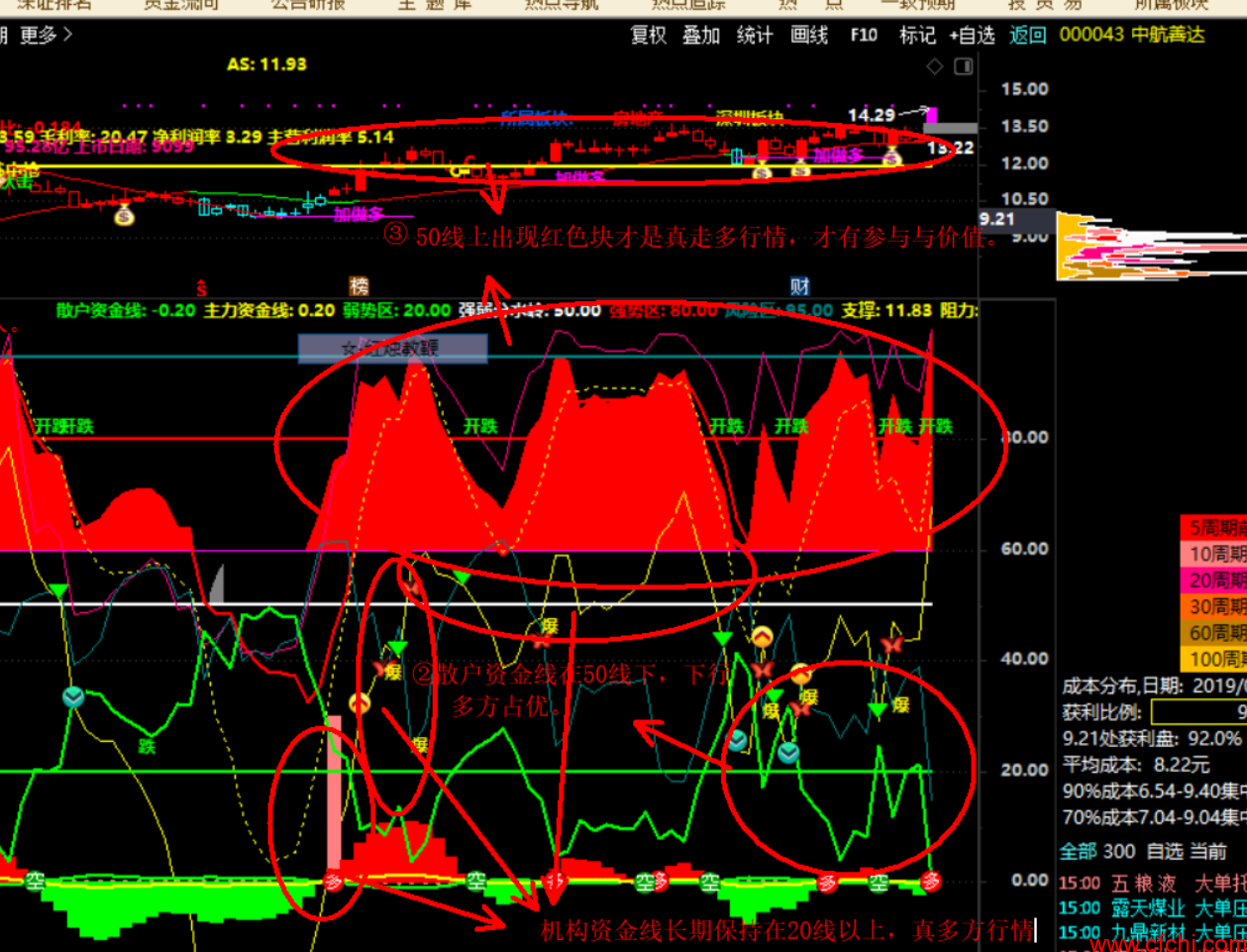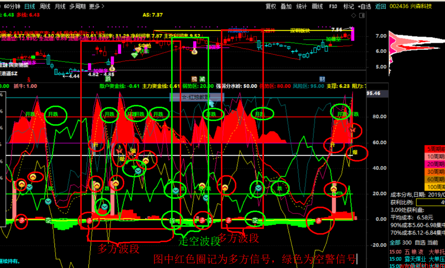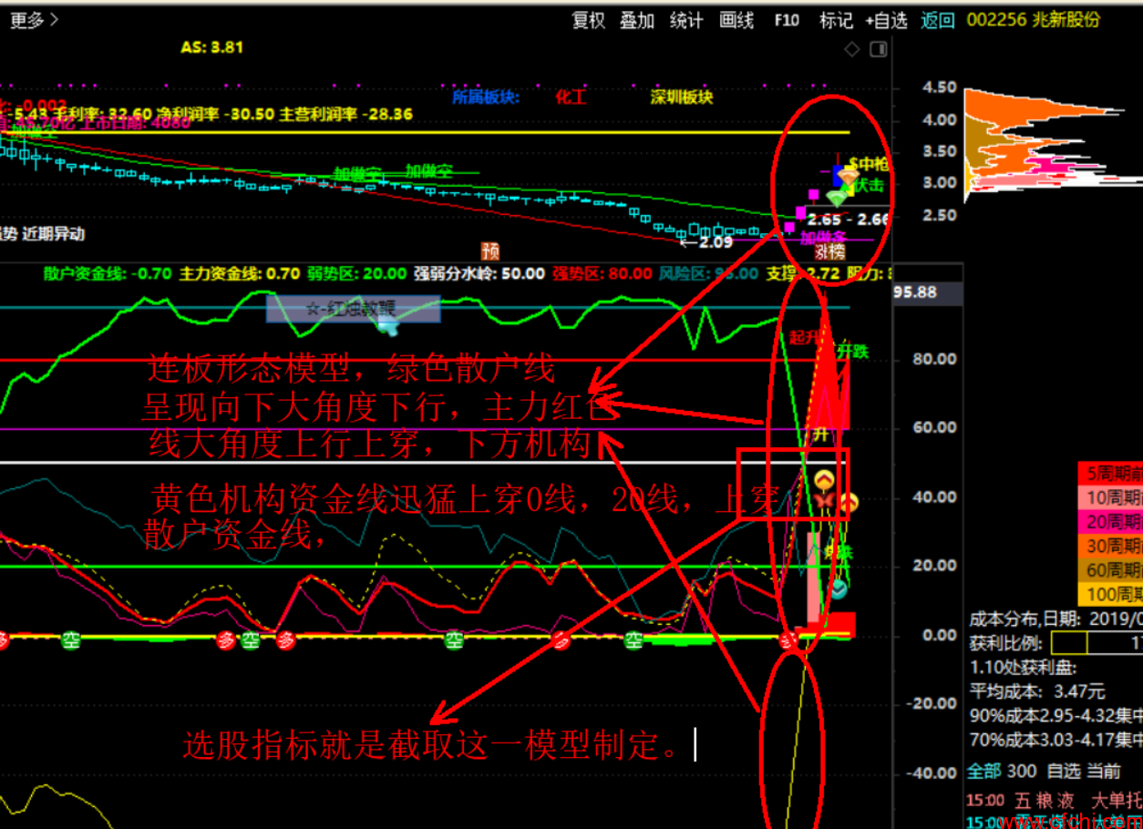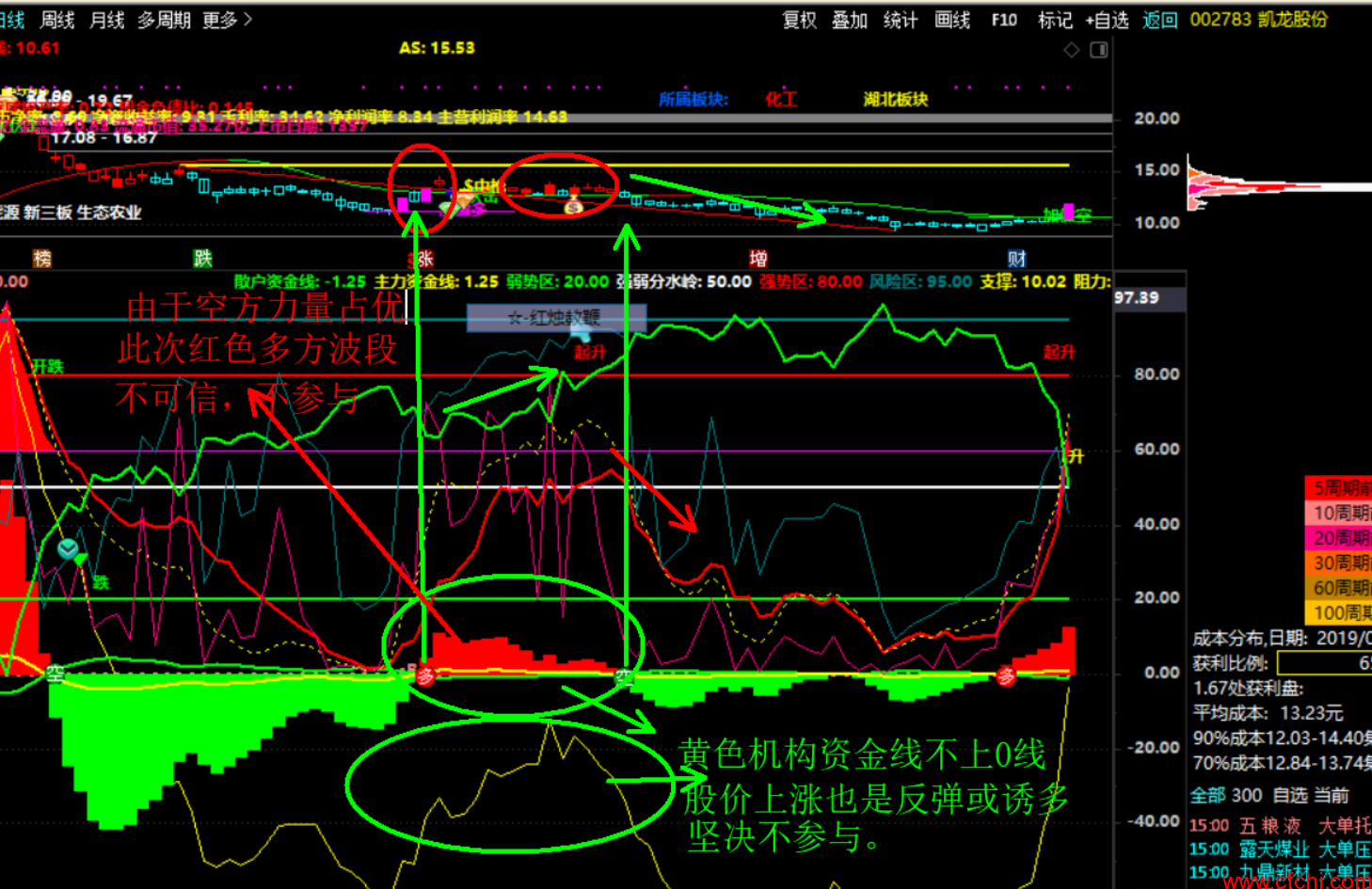 用法总结:①信号含义:红色为多方元素和信号, 绿色为空方元素和信号,多方信号出,关注,但不一定能介入;空方信号出,一般就要高度警惕,一旦股价唿应回调或大跌,即可止盈或减仓。②介入点:出现蝴蝶信号和“爆”字,此时机构资金线(黄色线)上穿0线甚至笔直上穿20线,强烈做多,意愿坚决,同时,主力红色线笔直上穿散户绿色线,走多意愿坚决,毫不犹豫,主力红色线笔直大角度上行,此时就是介入点,选股指标就是截取这一模型来做的。③出局点(卖出点)只要是已经博取相当的利润,或者出现空信号,股价随之走空,或者突然大跌,都可以考虑止盈。目前这种熊市行情,贸易战乌云时隐时现的大势下,出现空方信号就斩仓或者减仓止盈,是比较稳妥的自保方式,尤其是已经大涨的票,切不能贪。特别是绿色散户线上行过50,黄色机构资金线下0线,尤其要注意考虑出局。