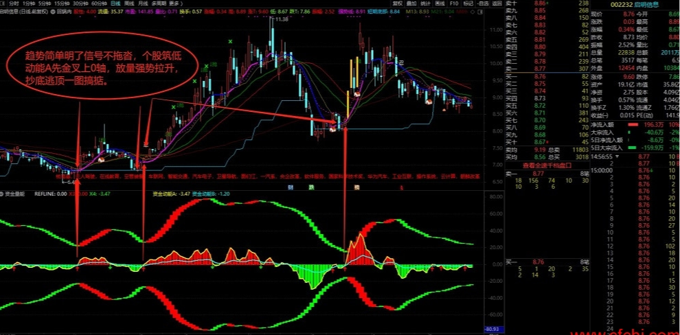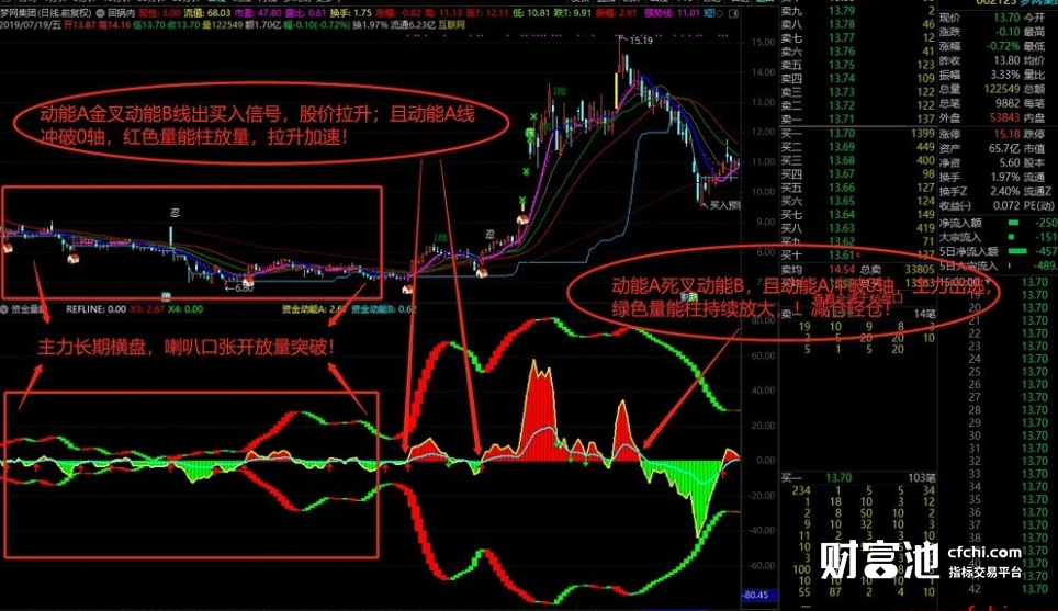 1、如图所示,指标中包含资金动能A黄色曲线和资金动能B浅蓝色曲线,动能A金叉动能B线出买入信号,股价拉升;且动能A线冲破0轴,红色量能柱放量,拉升加速。