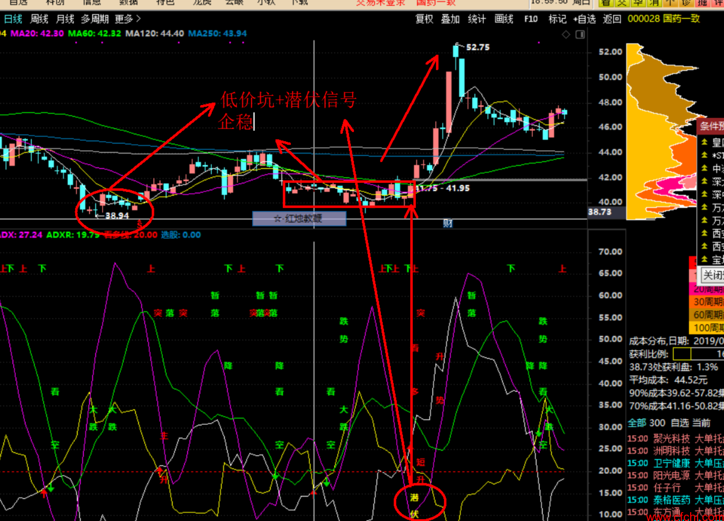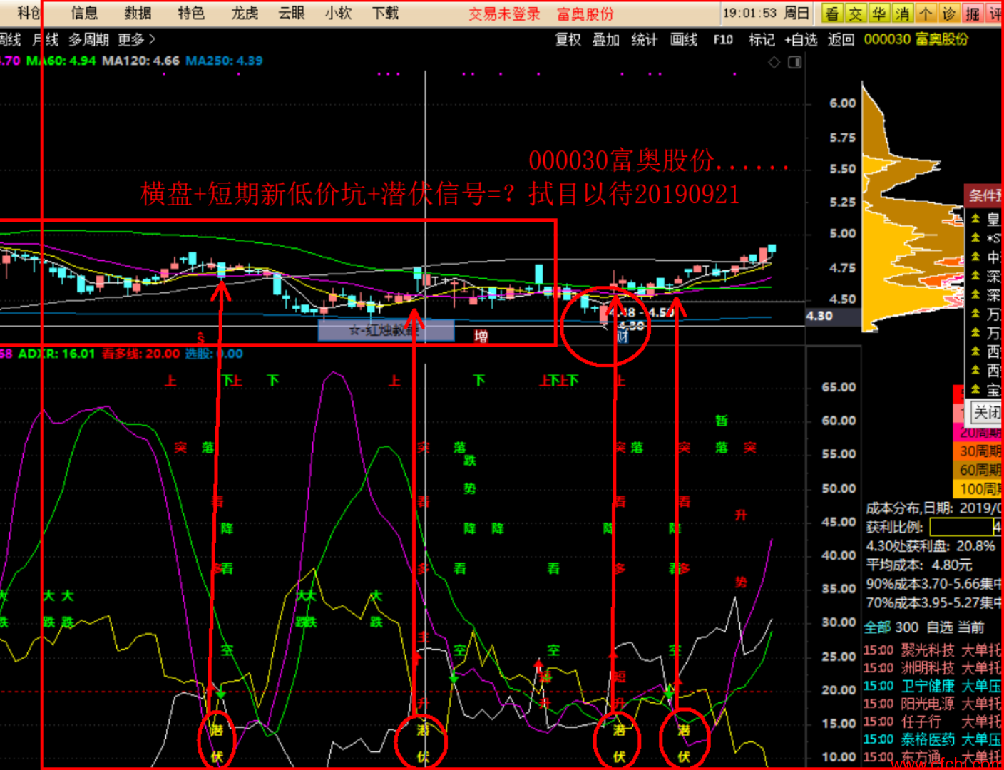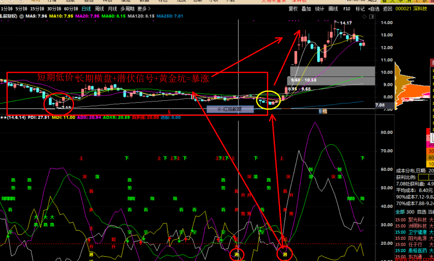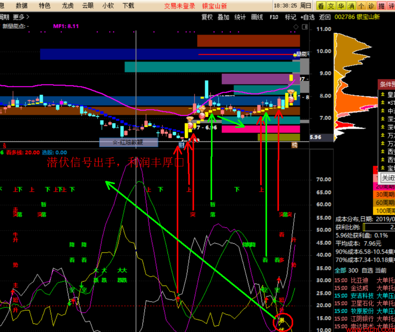 3.潜伏信号:潜伏信号我做成了一个选股公式,但不是所有信号都能成功,世界上没有一劳永逸的指标,也没有一成不变操盘的庄家主力,所以不要指望所有信号都管用,但选股选出数量已经相当少了,一般不超过20个。大家可以运用指标副图对照看过去的票,仿照副图说明,形成自己的选股模型:比如横盘+短期最低价+黄金坑+潜伏信号=暴涨......,这个需要自己反复去总结,相信各人有个人的妙用。