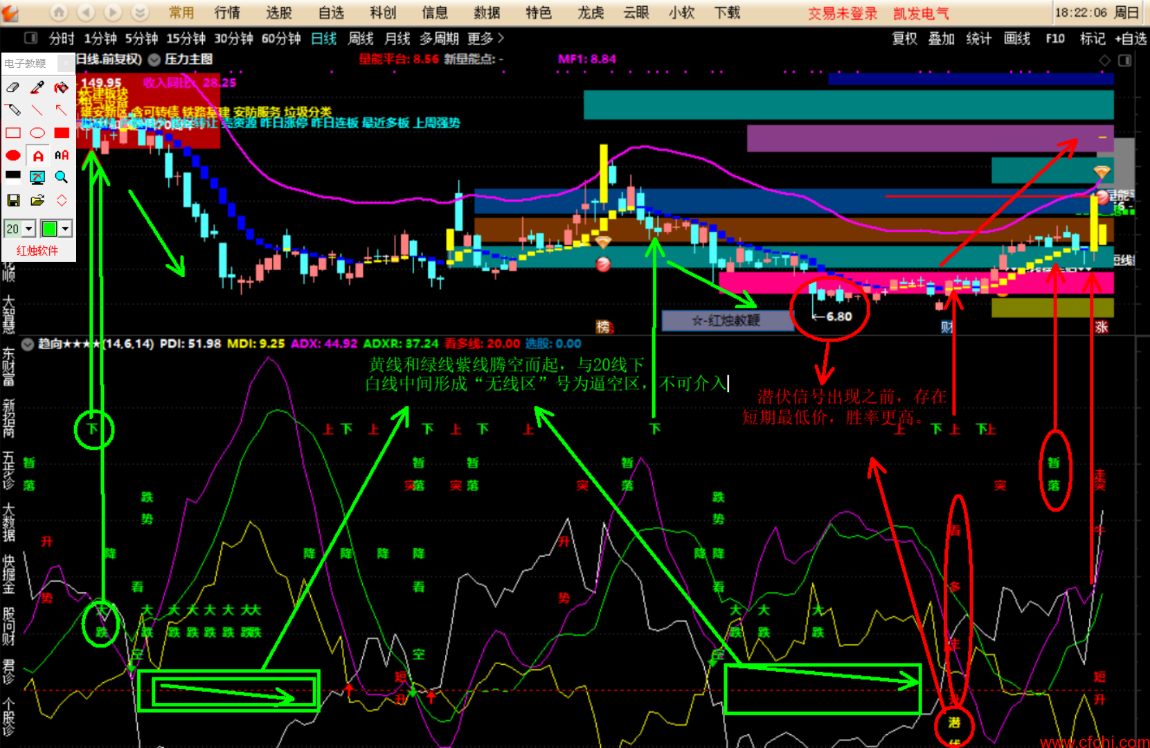 DRAWTEXT(叉 AND 逆势 AND PDI<20 AND MDI>20 AND ADX>20 AND ADXR>20,50,'势'),COLORGREEN;