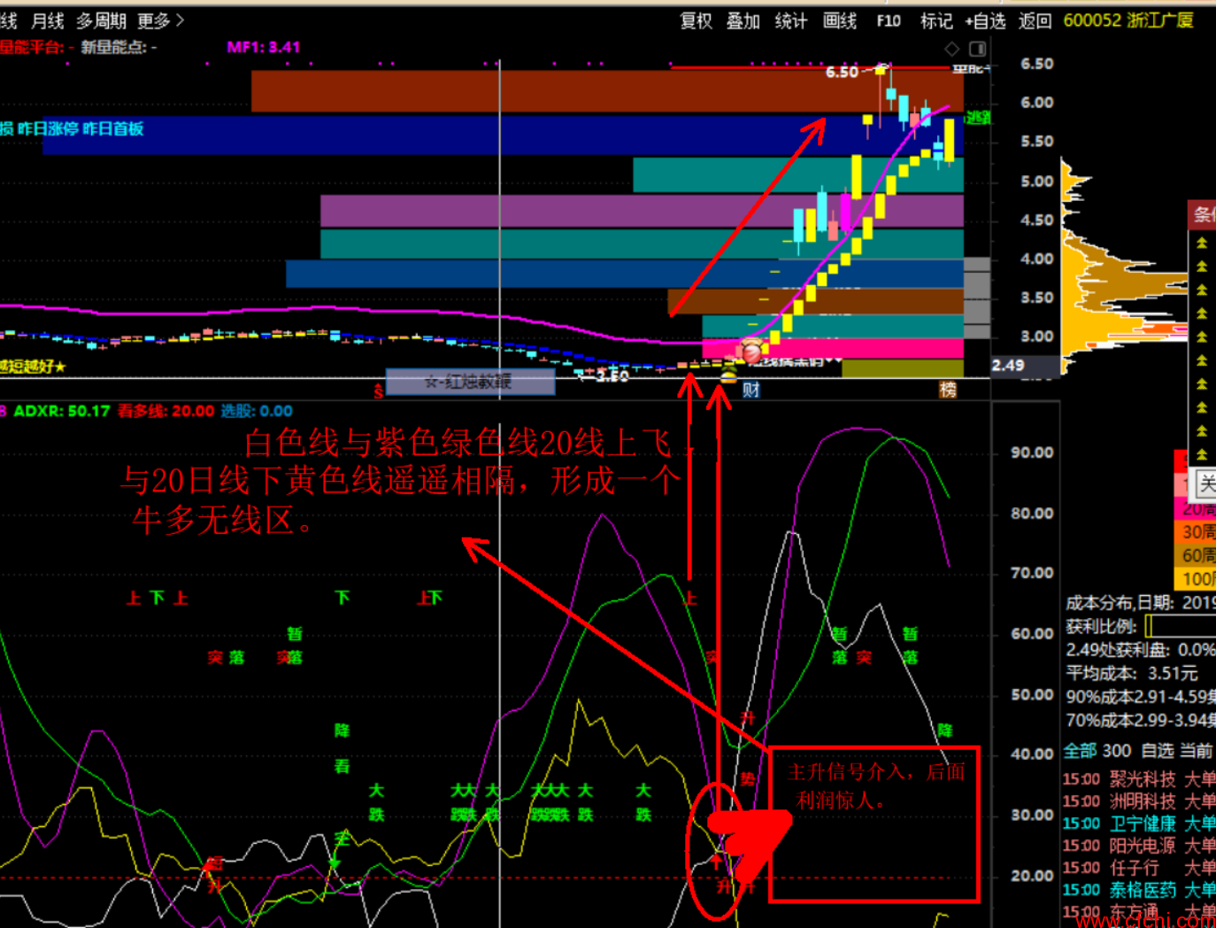 2.逼空无线区和牛多无线区:所谓逼空无线区,就是黄线和紫线绿线大角度上穿20线,同时白线大角度向下下穿20线,在多空双方在20线上下长期形成一个无线区,此区间不宜参与,经常伴随下跌,有多信号也是诱多;所谓牛多无线区,就是白线和紫线绿线大角度上穿20线,同时黄线大角度向下下穿20线,在多空双方在20线上下长期形成一个无线区,此区间为涨势区,经常伴随大涨,有空信号也是诱空。