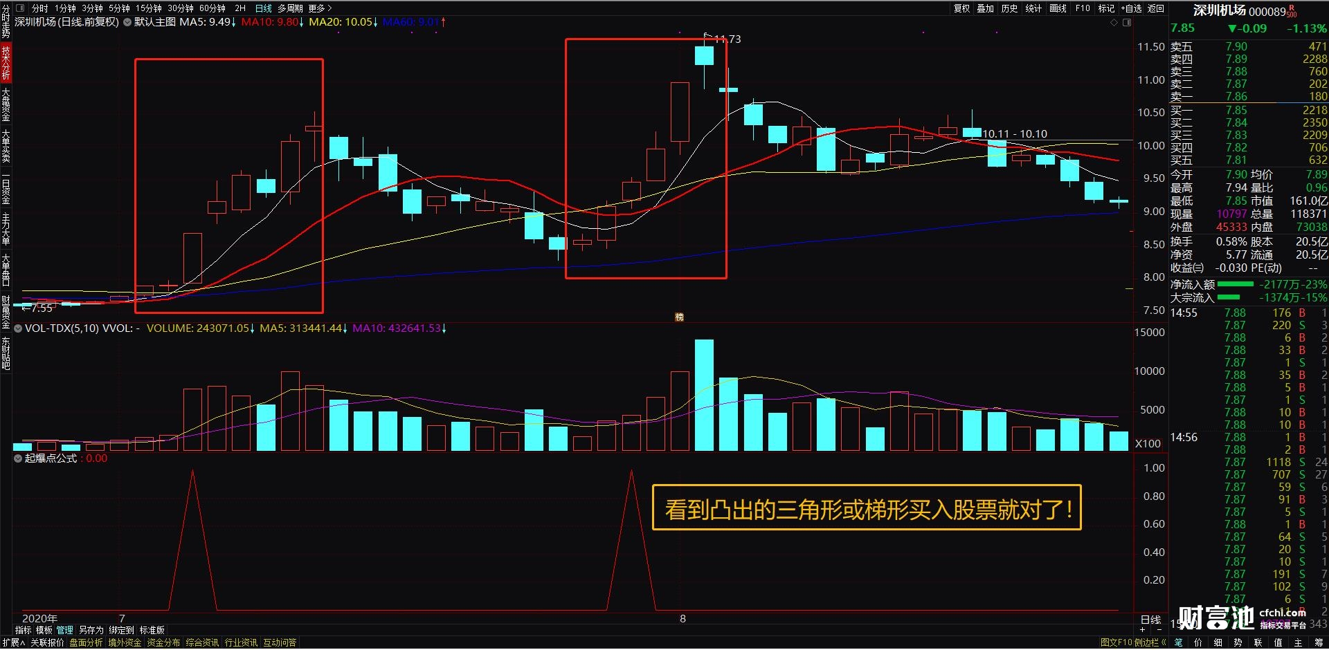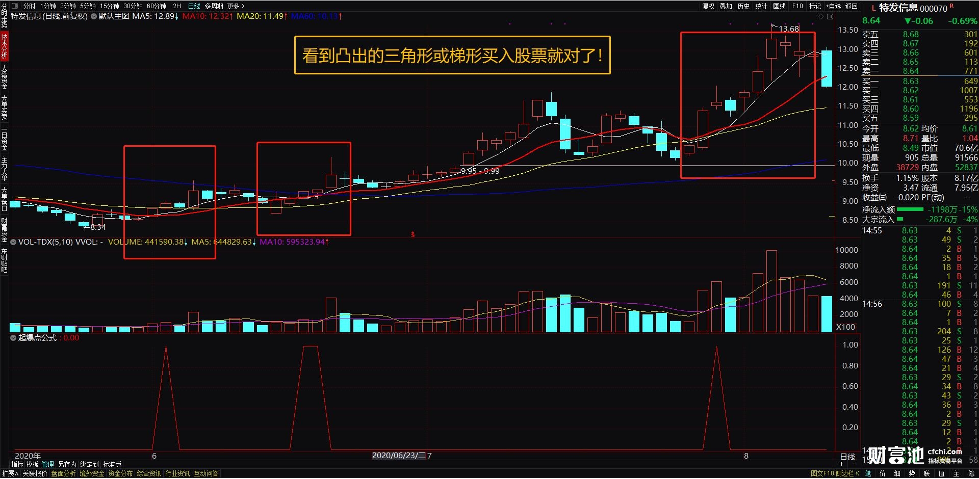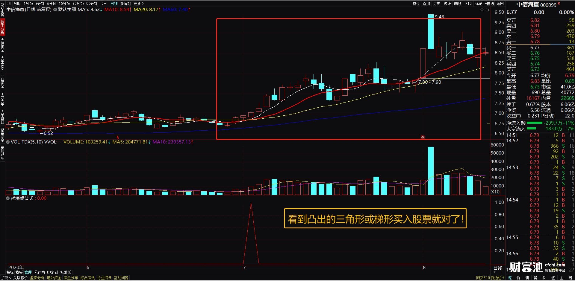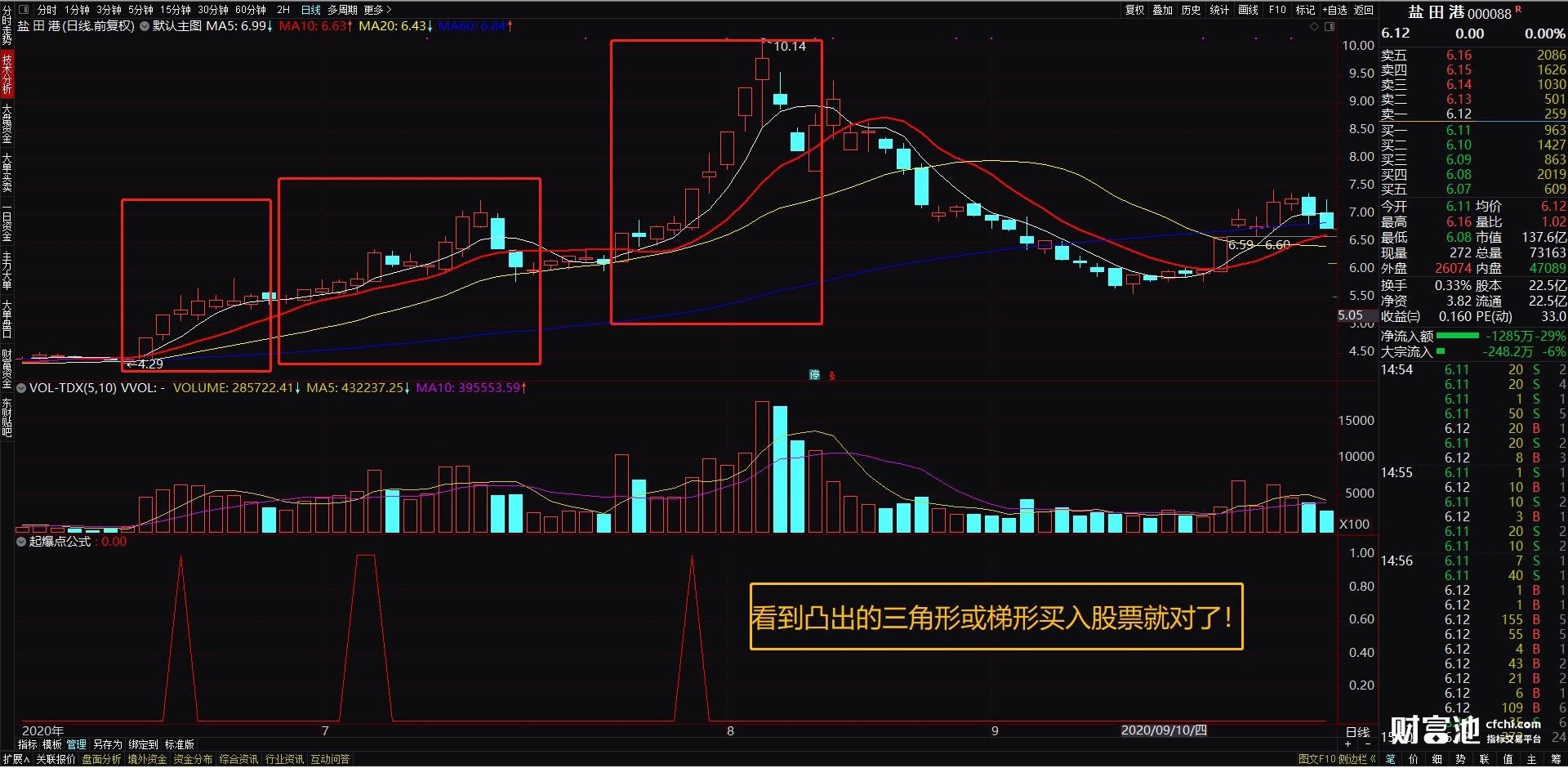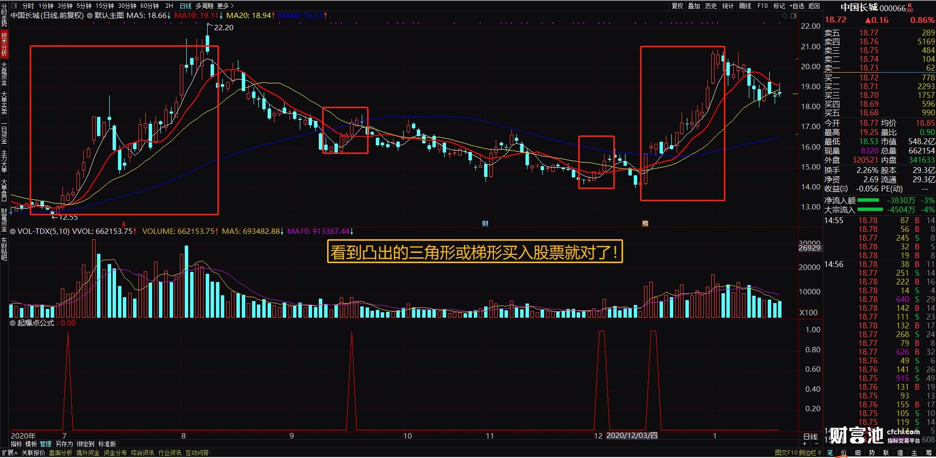 2、指标操作方法:它是一个副图指标公式,看到向上凸起的三角形或梯形就是股票的买入点了。