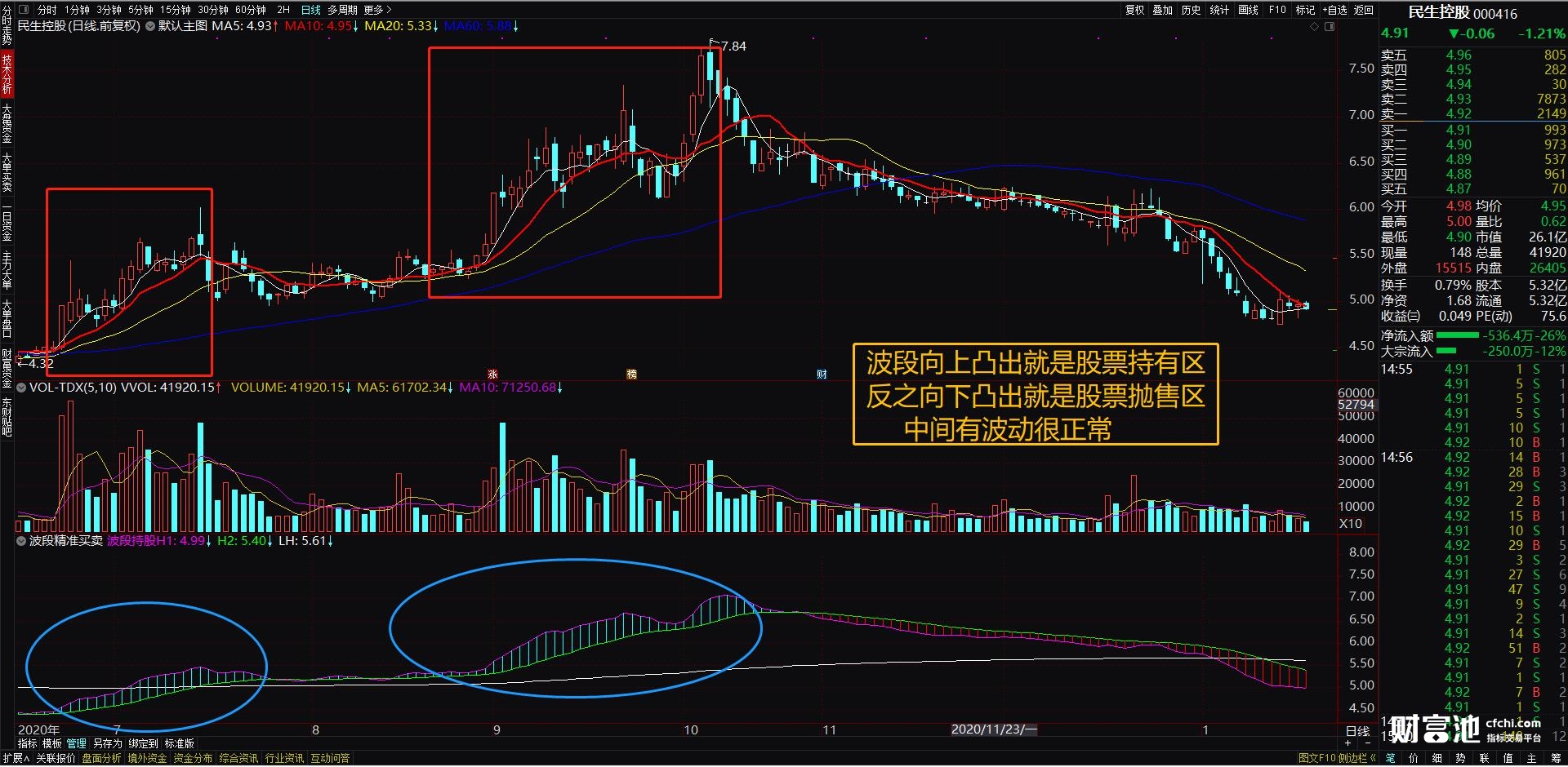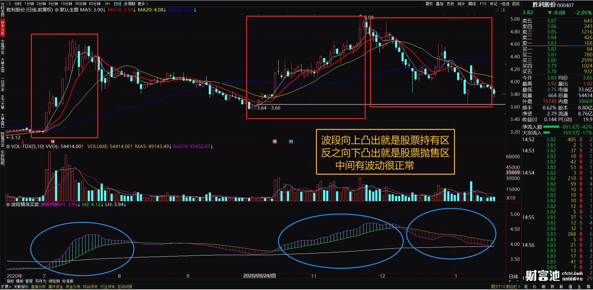 2、指标操作方法:它是一个副图指标公式,主要看凸出波段线,此阶段就是持股区,有小波动是正常的,如果波段区向下凸出,就卖出股票。