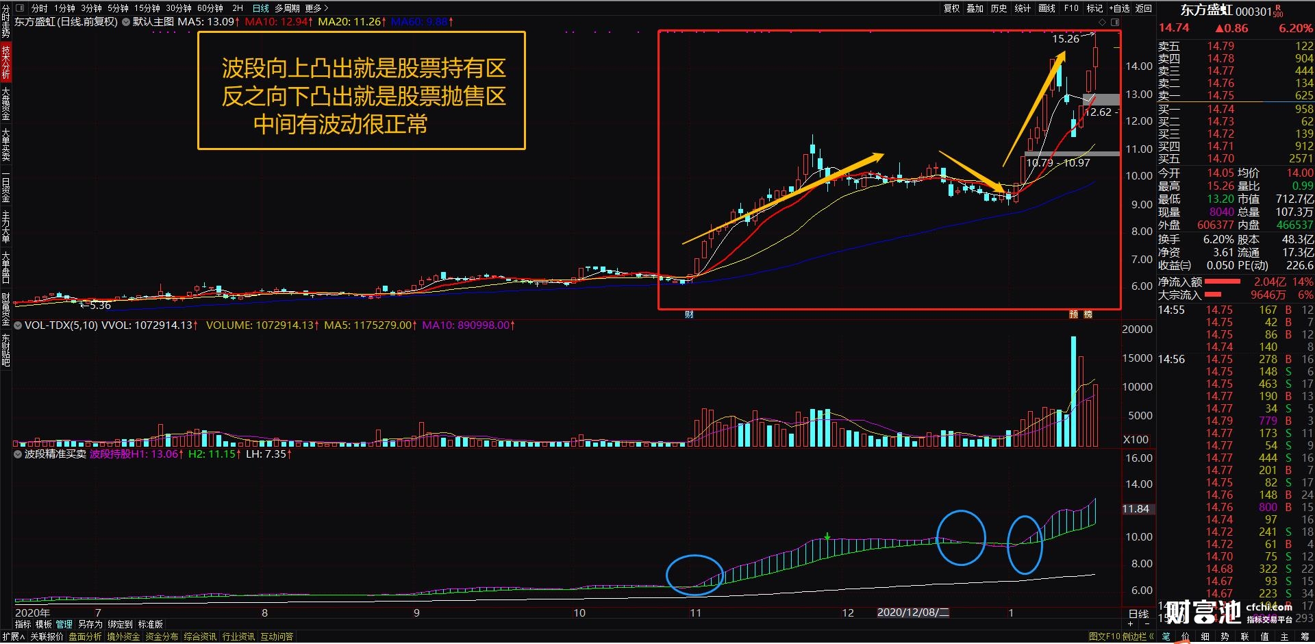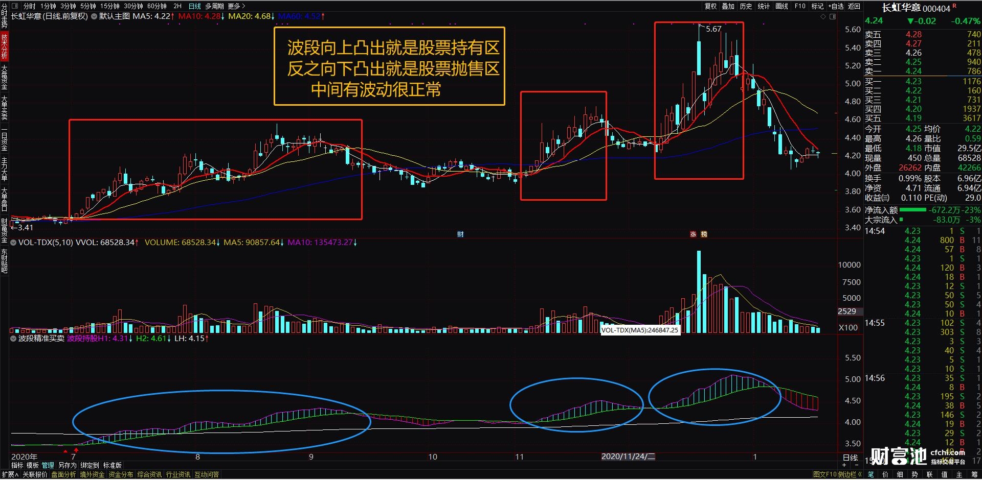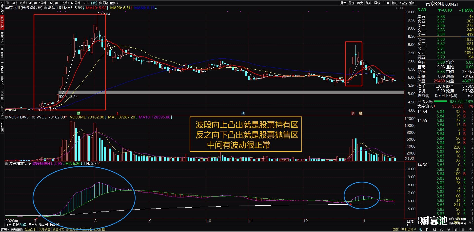 理论总结:看准凸出的波段线区域,此区域就是股票持有区,向下凸出的波段区域就是股票抛售区。