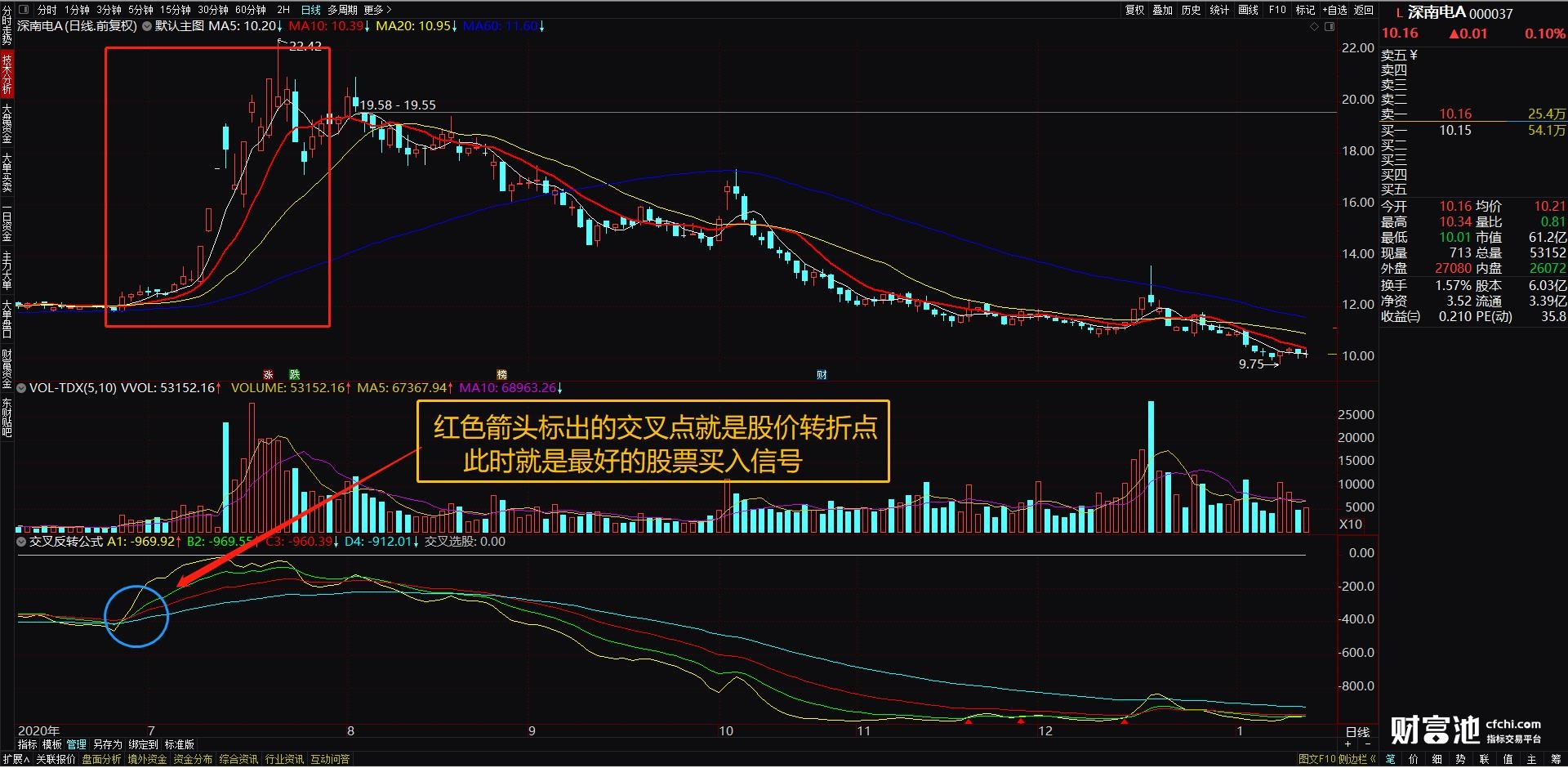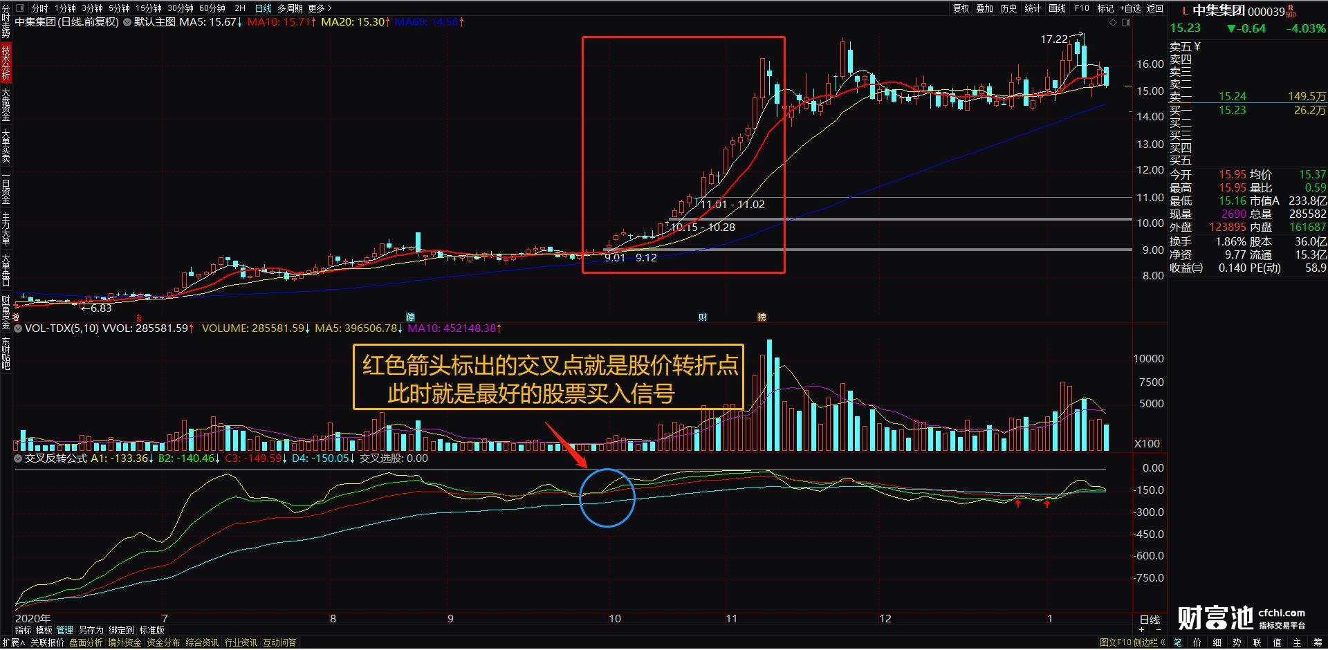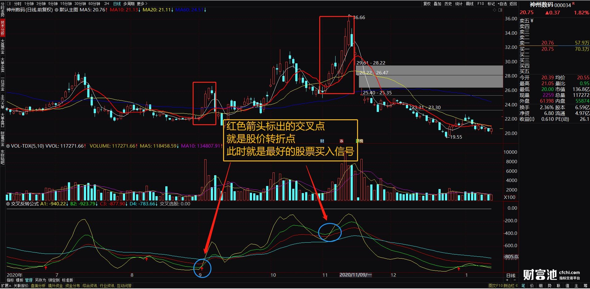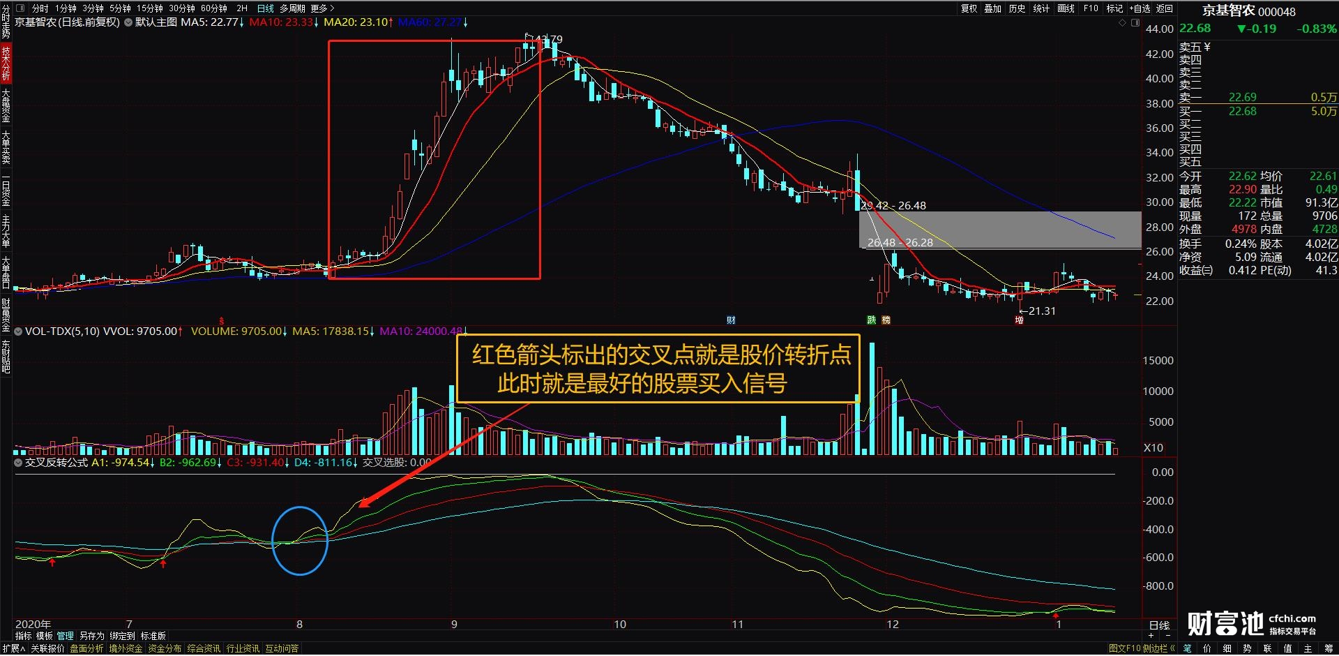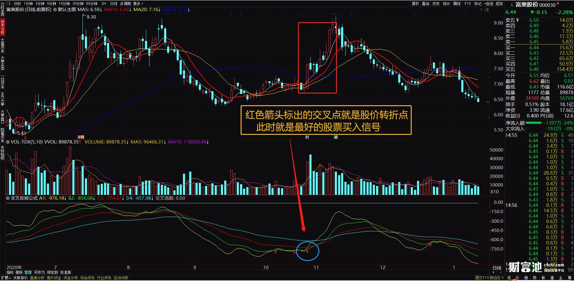 4、指标详解:红色箭头标出的交叉点就是股票买点信号,简单易懂。