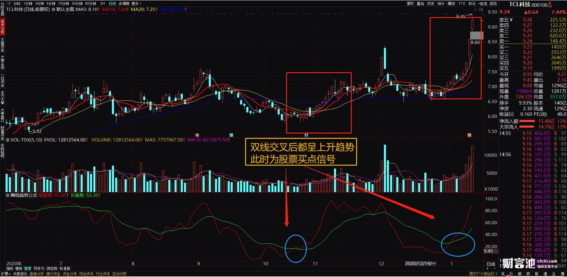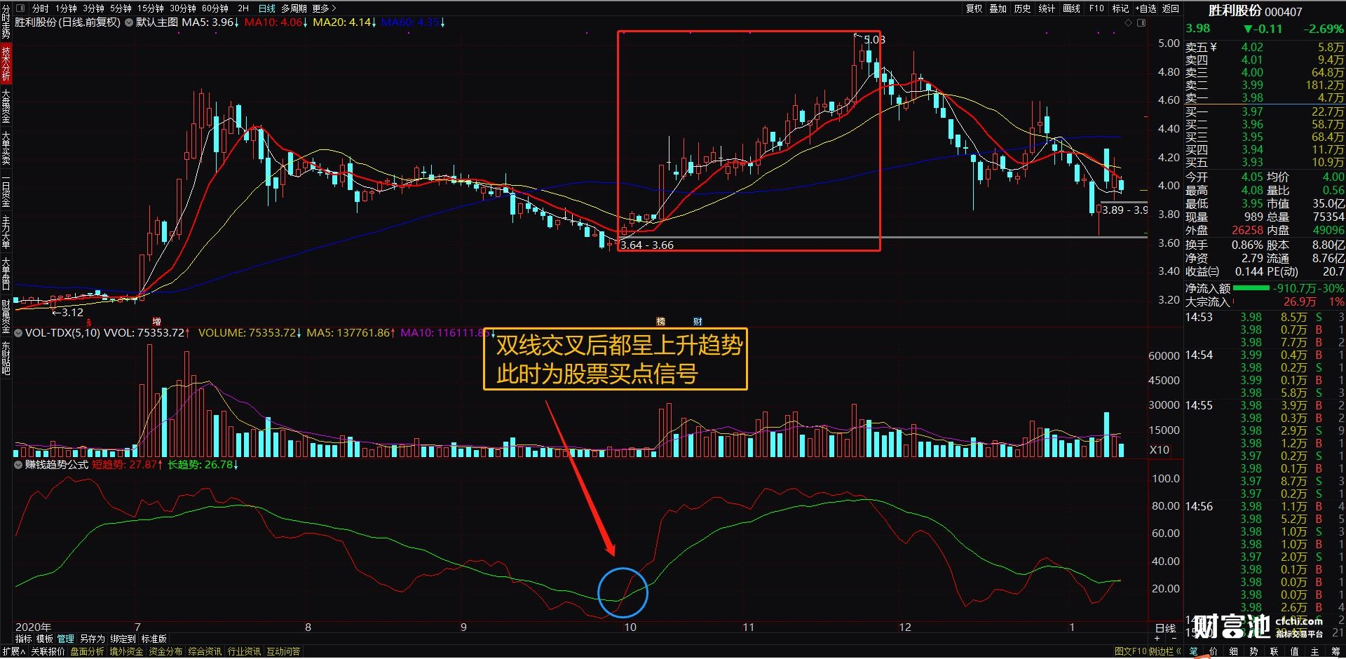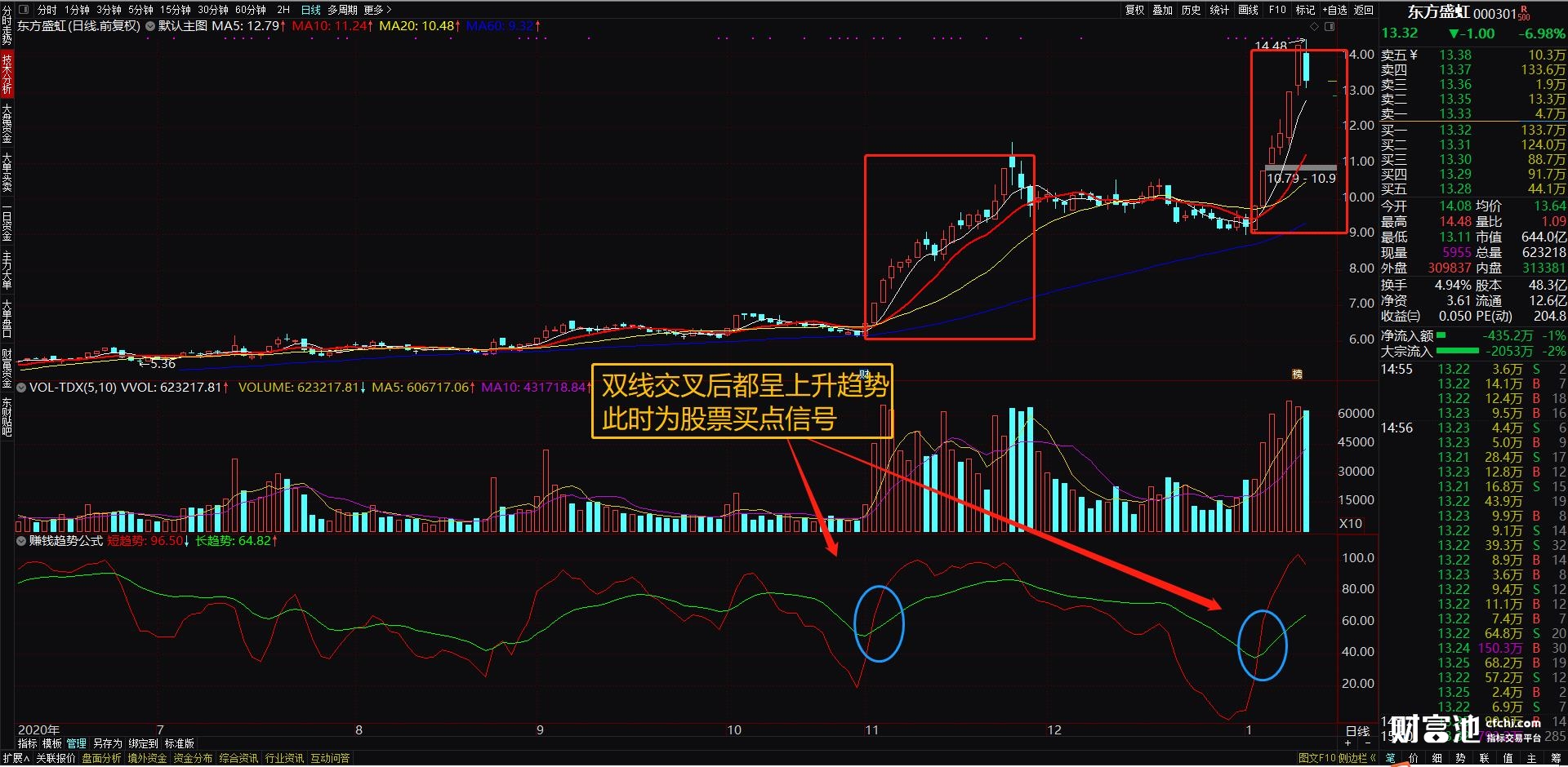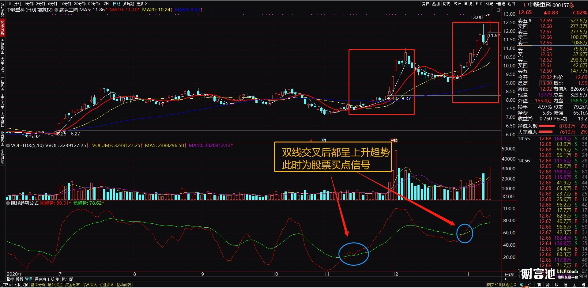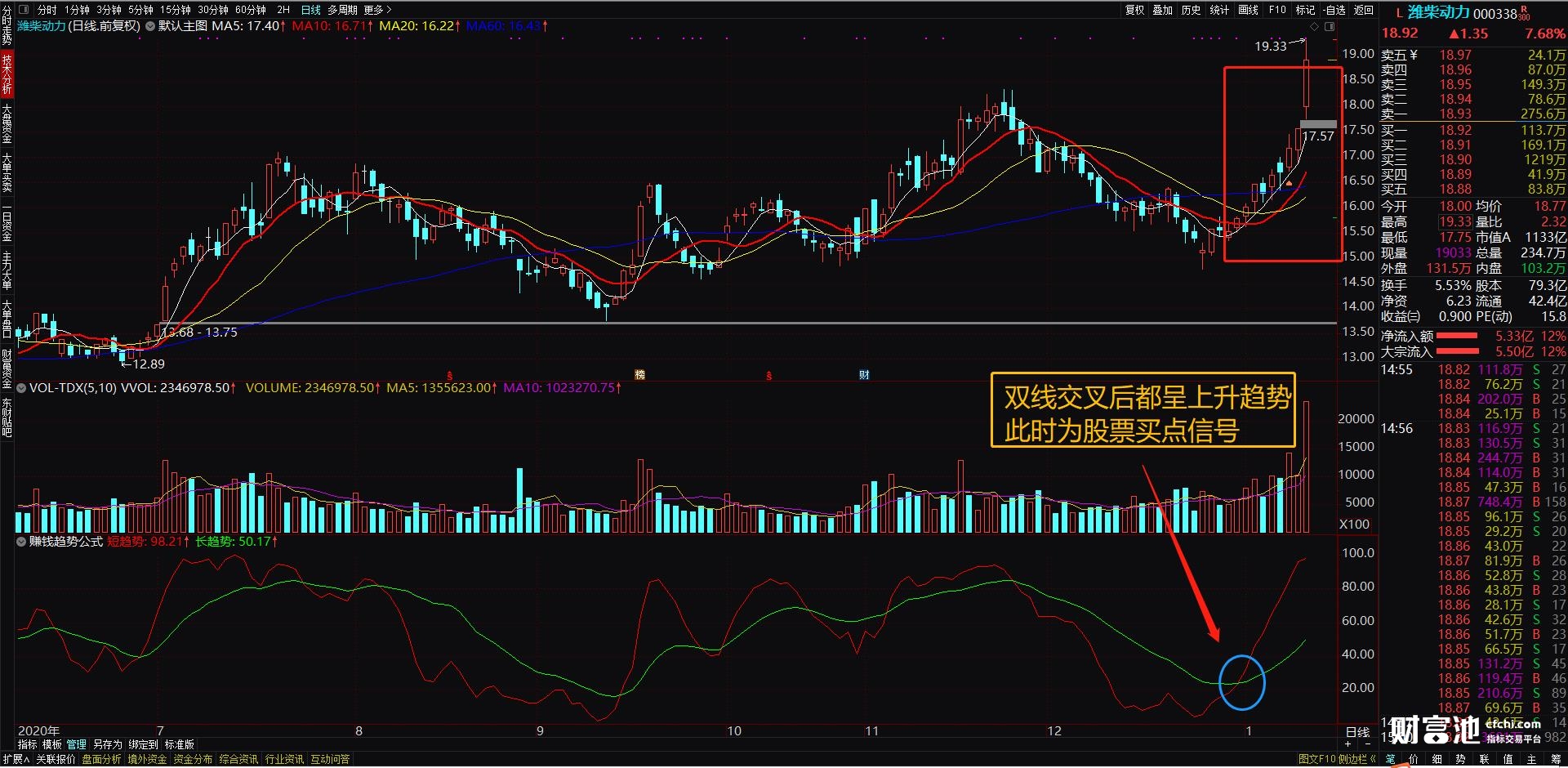 4、指标详解:红色线代表短趋势线,绿色线代表长趋势线,当两线交叉后都呈上升趋势,则股价上涨。