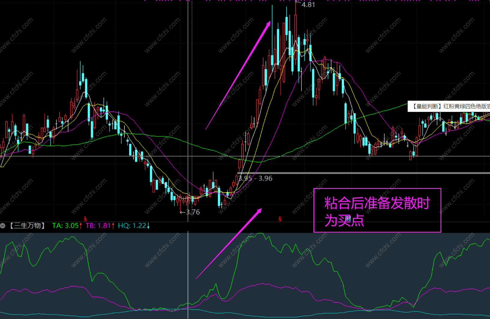 三线粘合至多头发散的时候为买入点, 实战操作强,发散区间获利空间大,值得好好研究