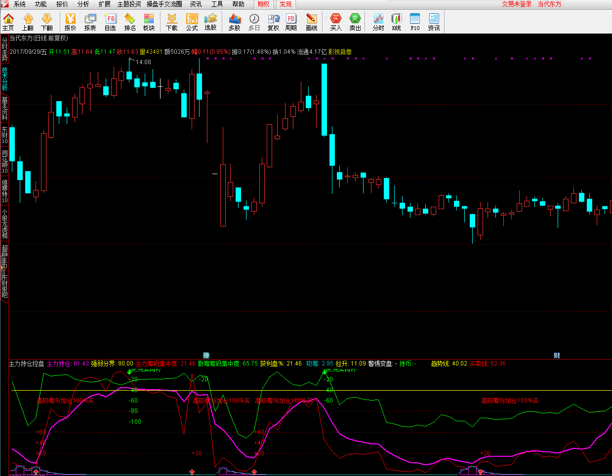 说明:结合主图判断底部吸筹情况和主力持仓是上升还是下降。主力持仓上穿散户筹码,主升浪买进,一路持有.十次八次成功,配合均线.主筹达到80%,散筹方向向下,说明主力已高度控盘筹码大部分锁定,等待主升浪。判买点.顶底,比较适合波段操作。
