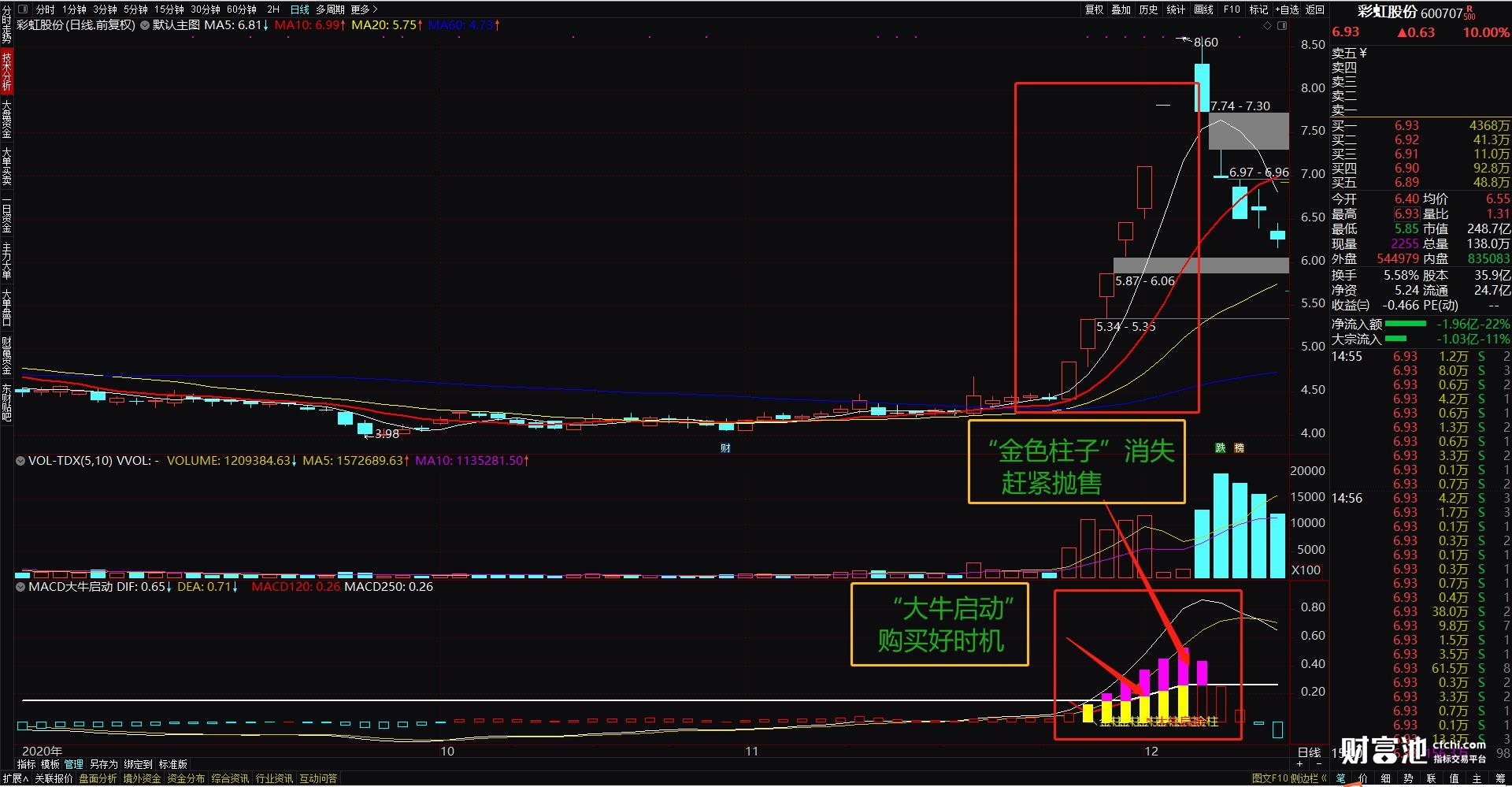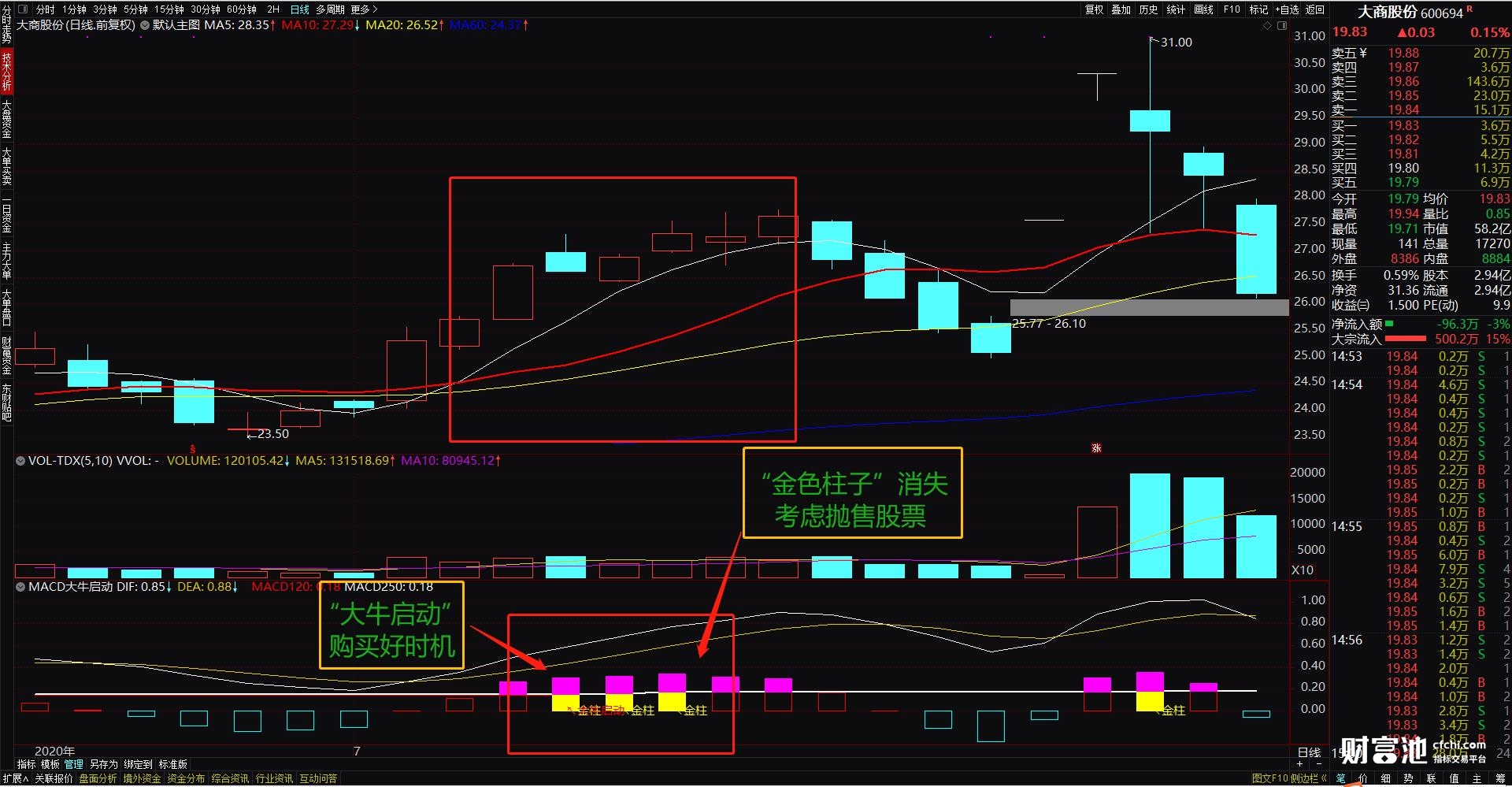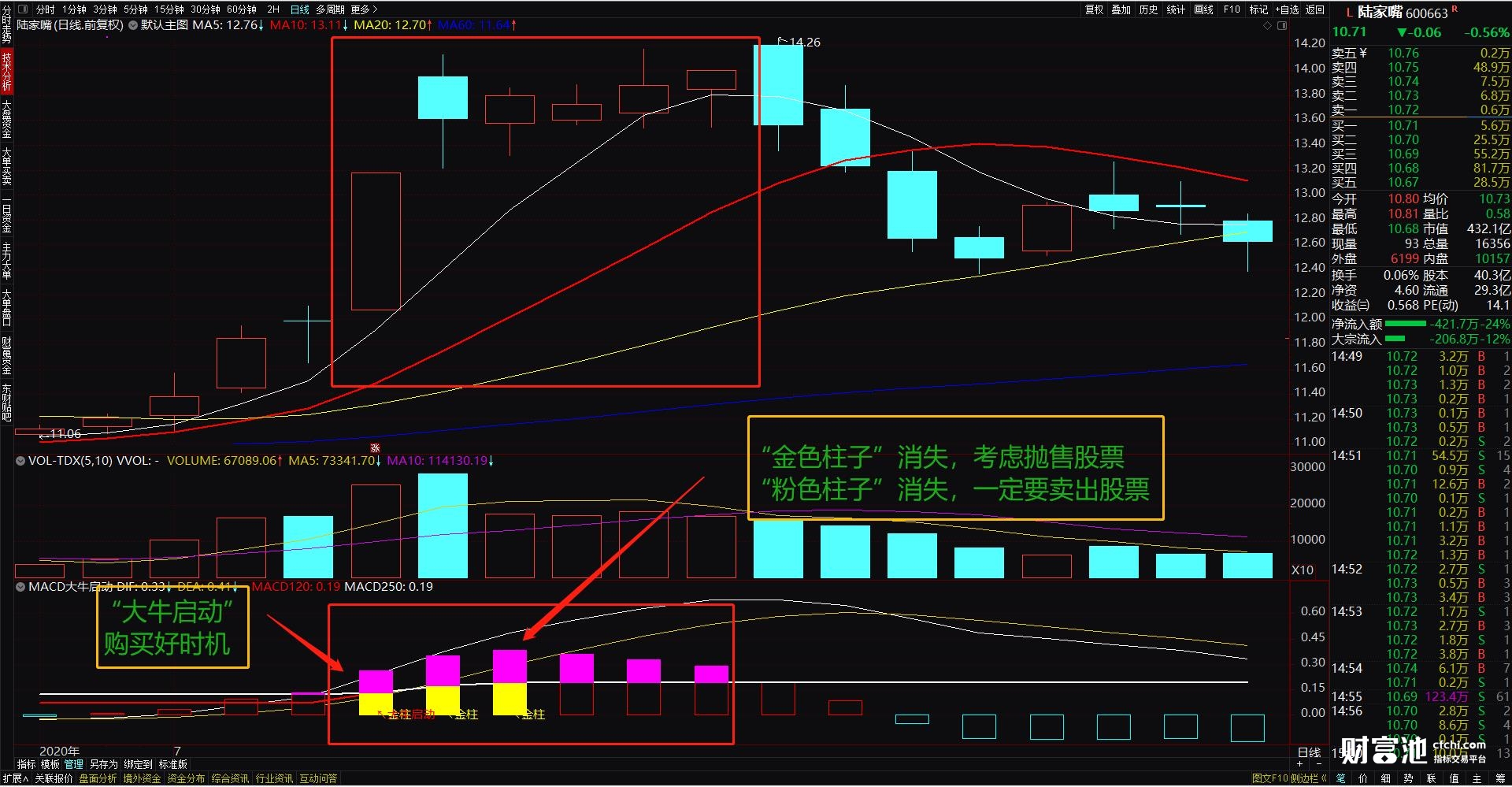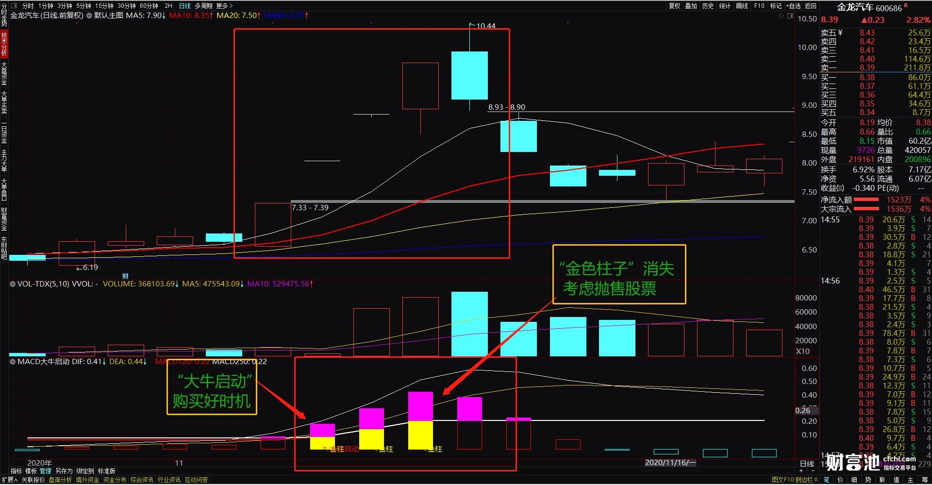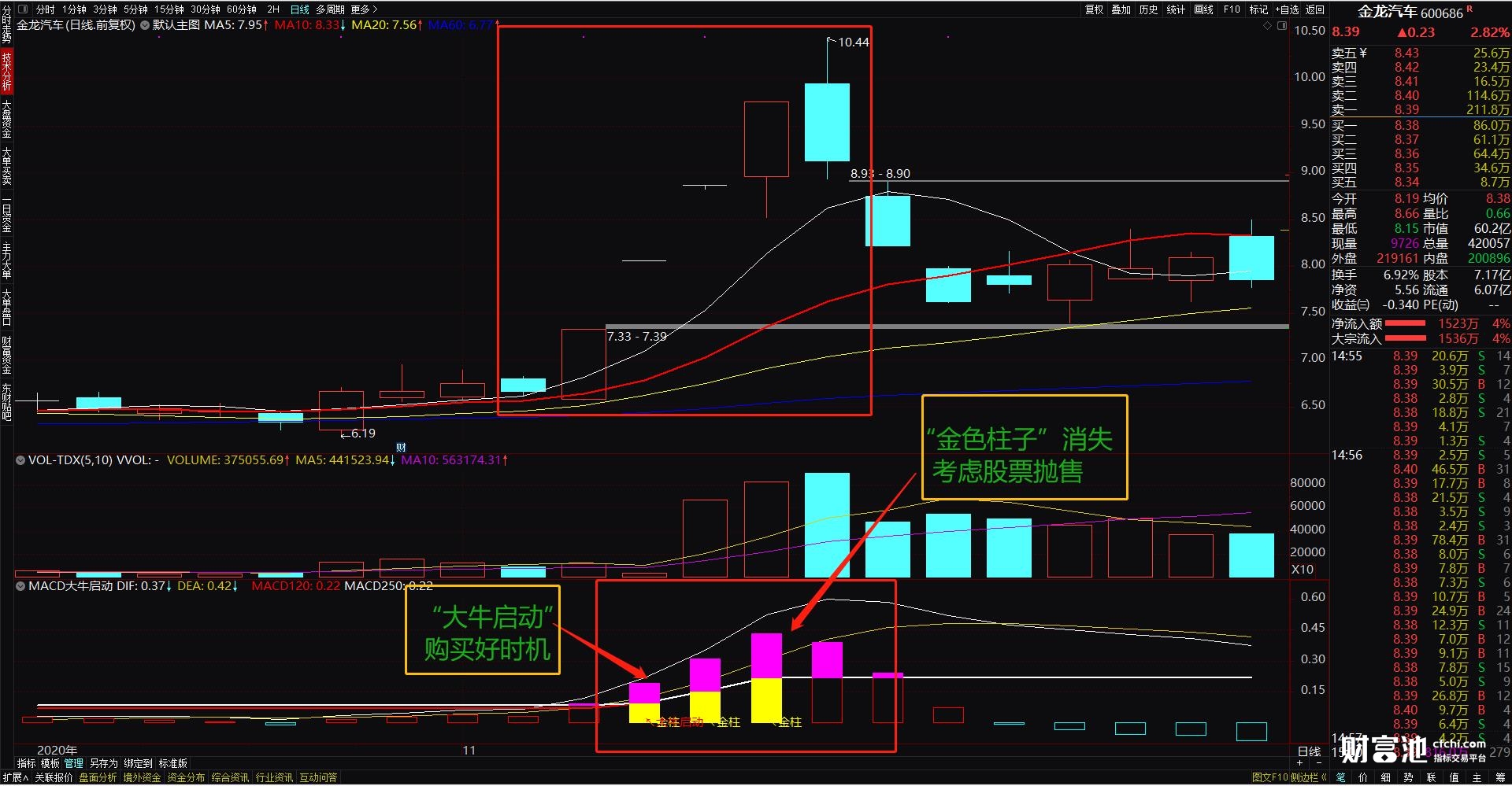 出现“金色柱子”要关注,出现“大牛启动”字眼就是购买的最好机会,“金色柱子”消失就要考虑卖出股票,“粉色柱子”消失一定要抛售股票。