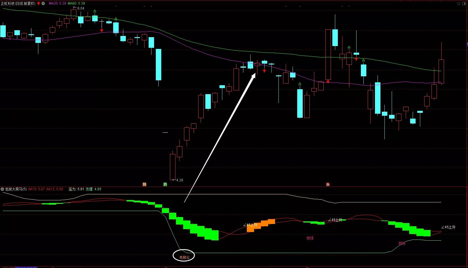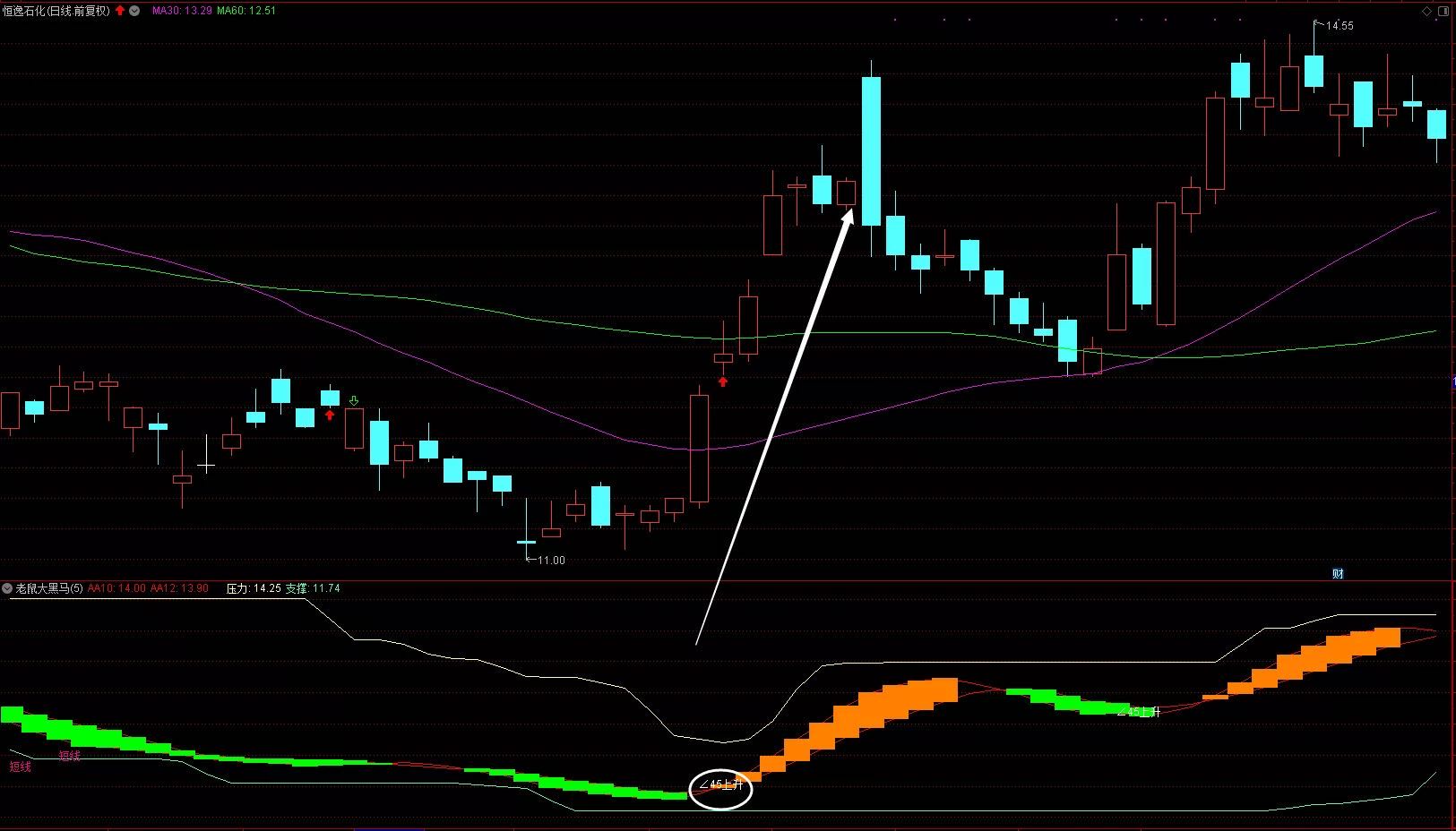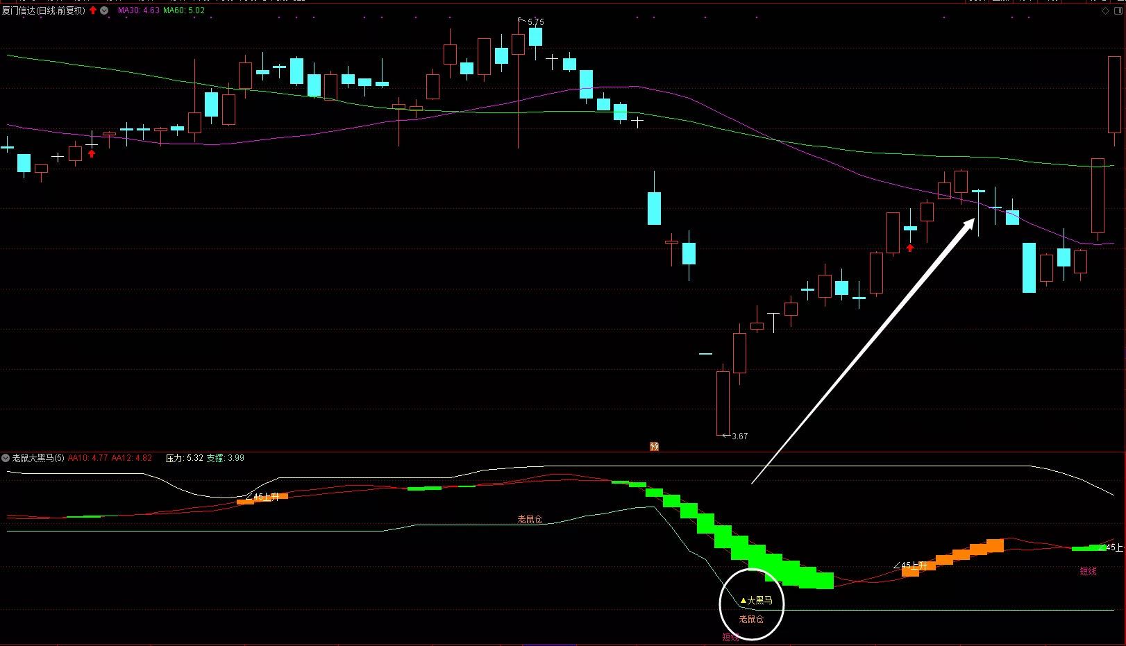 2、该指标之所以叫“老鼠大黑马”,就是教大家寻找出现老鼠仓和判定为大黑马的个股,因此称之为“老鼠大黑马”,当指标出现老鼠仓或者大黑马信号提示时,此时就是我们的买入时机。