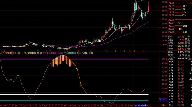 用这个指标判定大的方向,非常精准,所以这个指标也比较合做长线,用这个指标的时候先用月K线图来看,一看就清楚了……在主力做大底轴线勾头向下的时候可以根据日K线分批进场