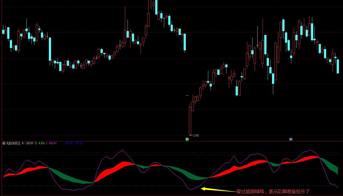 A:波段王指标底部启动点,底部绿色实体偏小,然后开始冲高,为起爆点