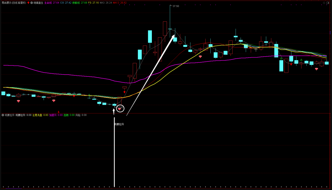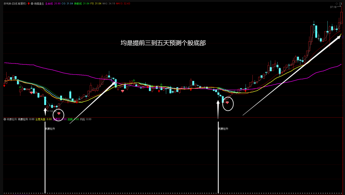 6、将要拉升信号一般可以提前三到五天提前预知个股见底,可以说非常具有参考意义。该指标若能结合韩老师之前给大家分享的“绝境逢生”指标使用效果更佳。