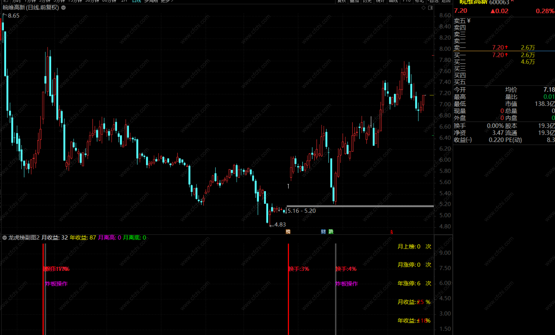 当满足条件换手>20AND换手<50ANDA>0时,在7.5位置书写文字,画洋红色