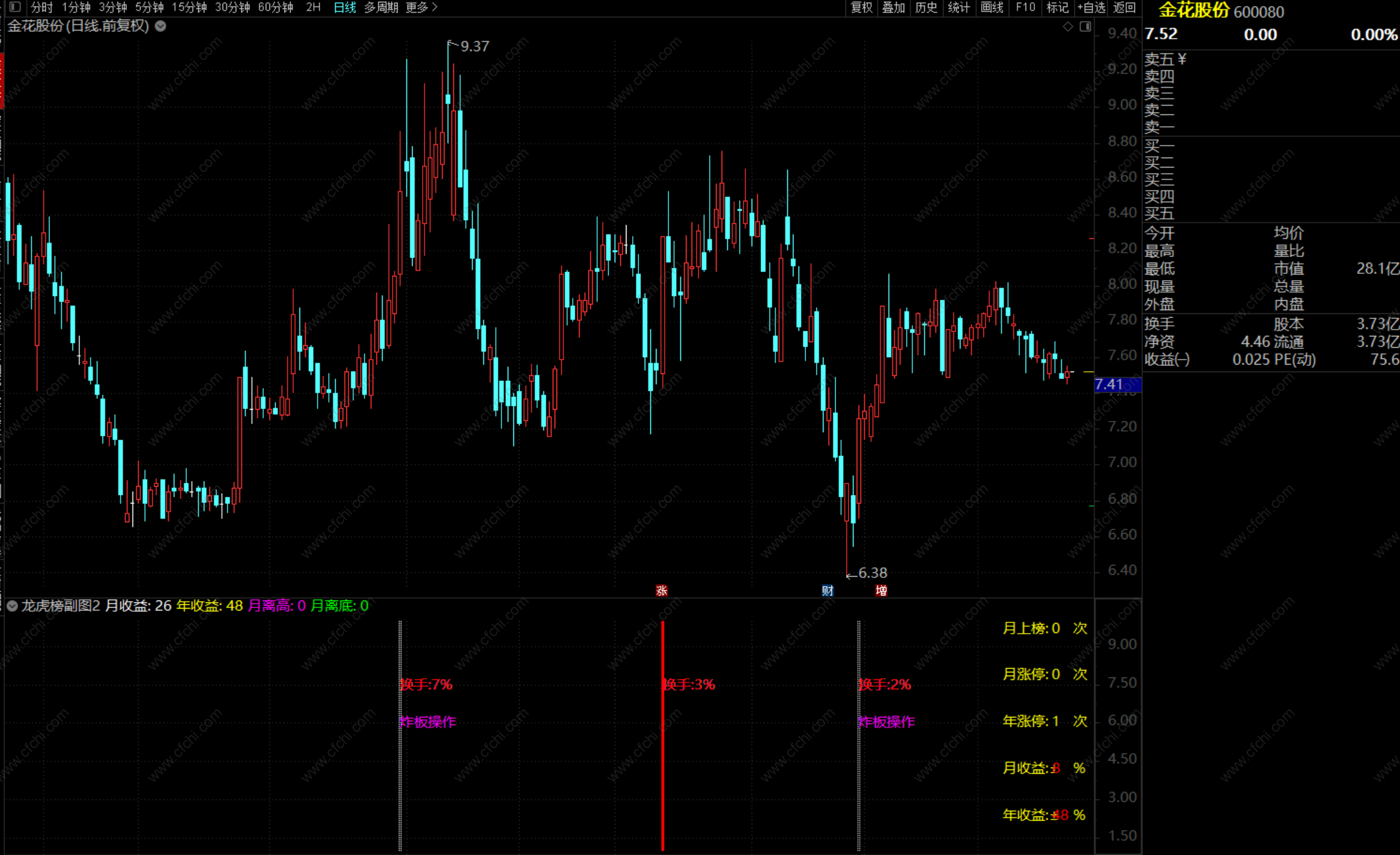 当满足条件换手>=50ANDA>0时,在7.5位置书写文字,画红色