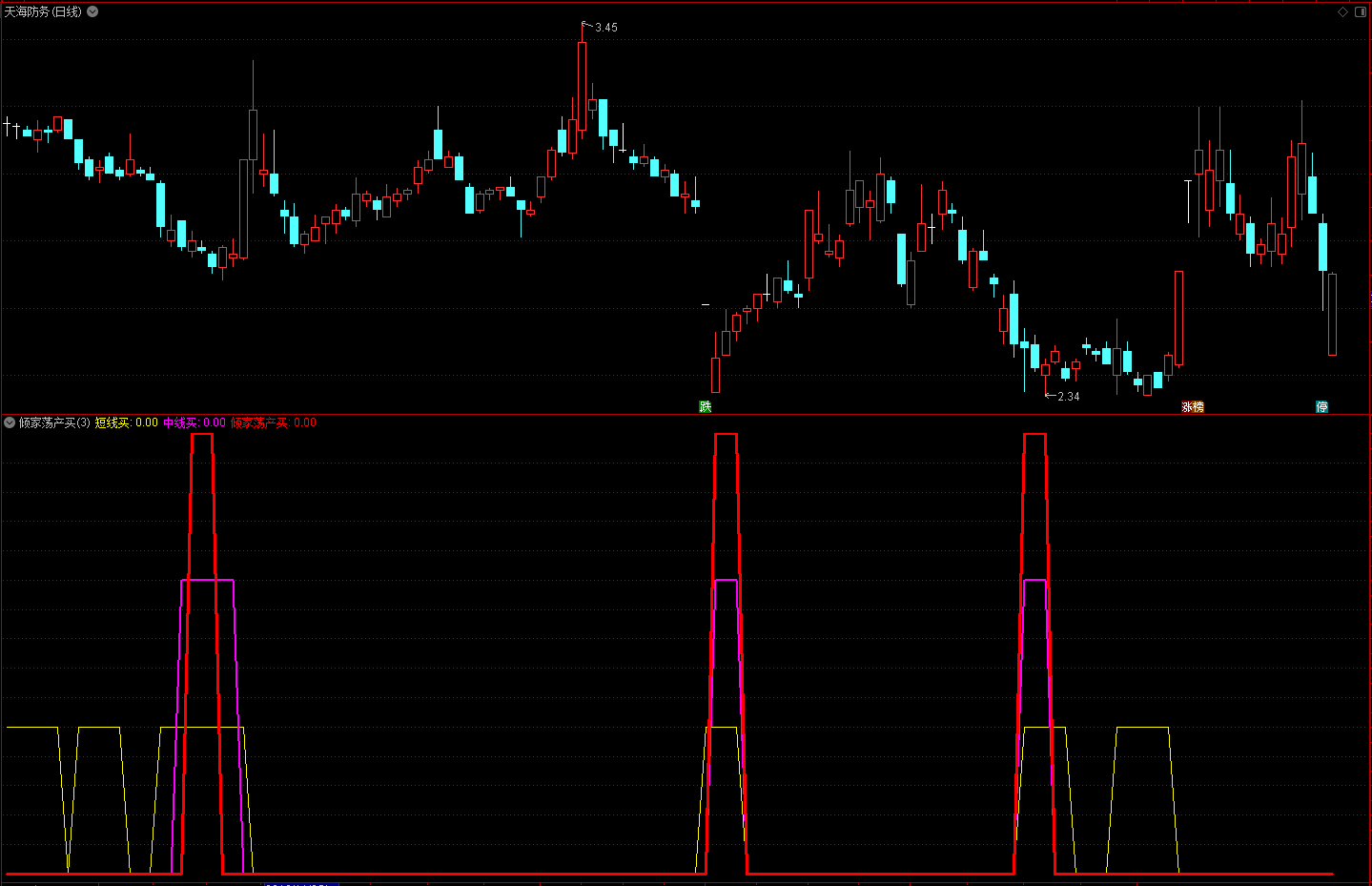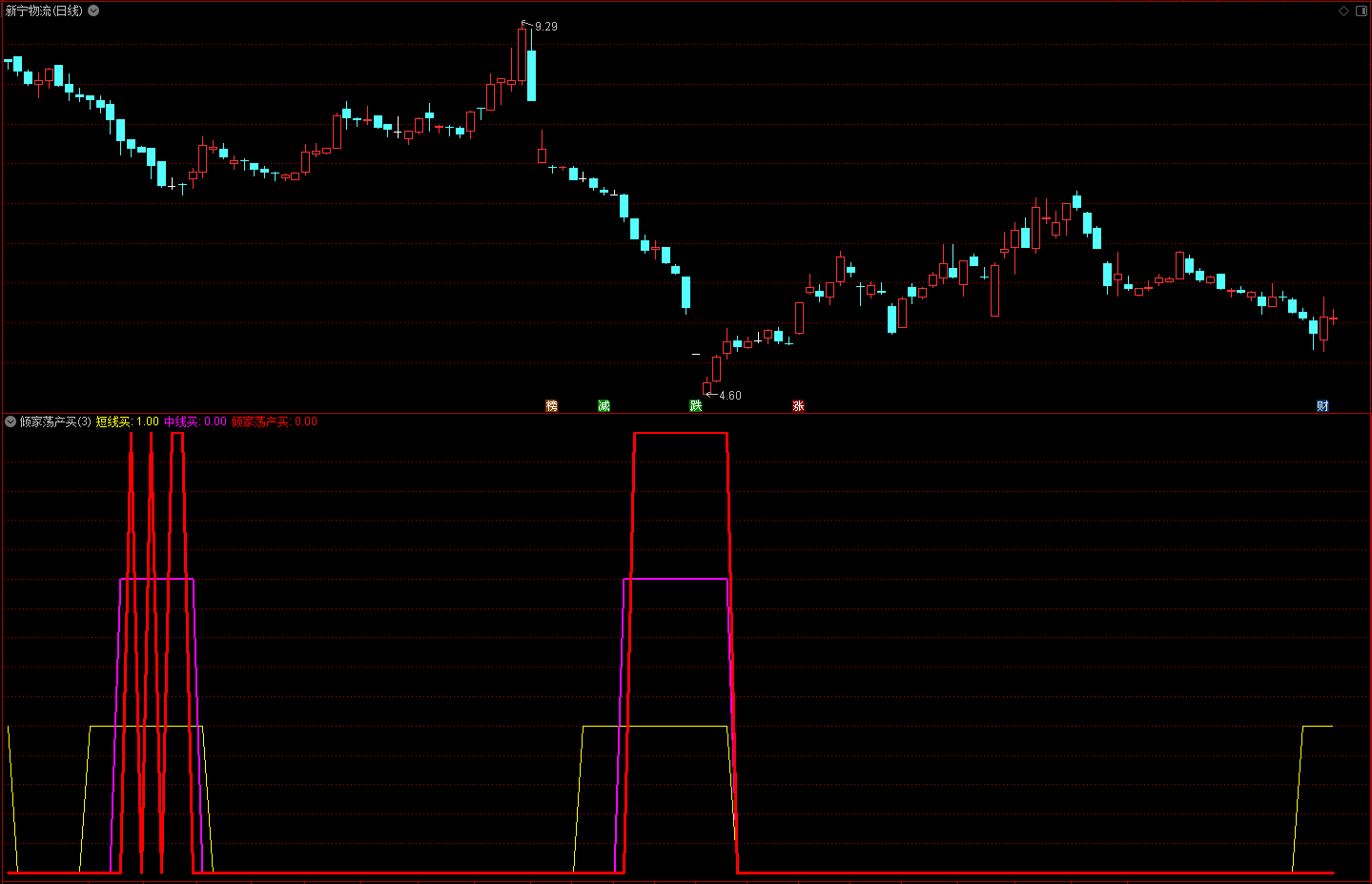 中线买:如果绝佳买点>10000AND绝佳买点>20000,返回2,否则返回0,COLORFF00FF,线宽为2