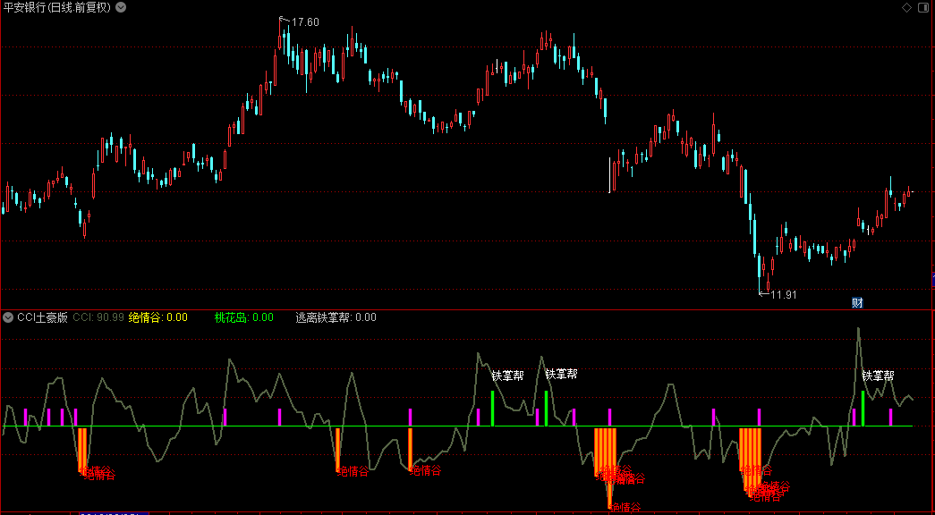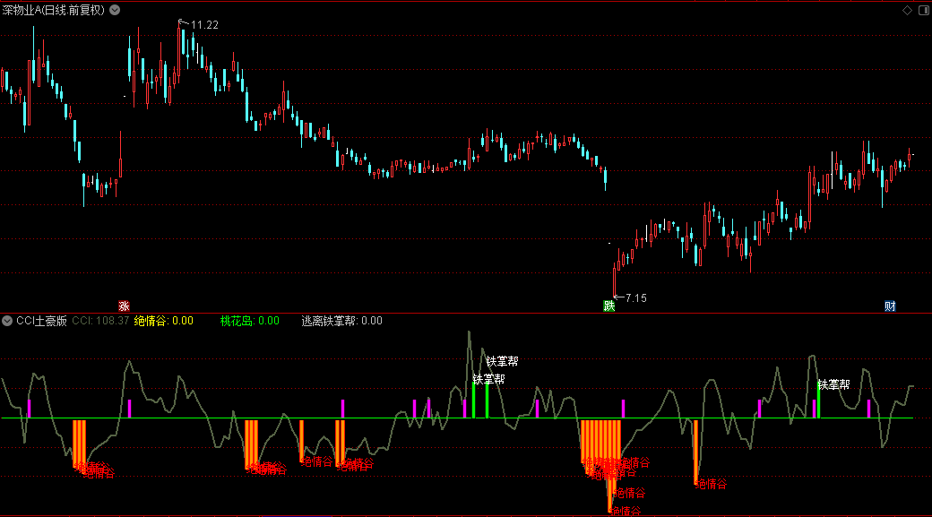 当满足条件绝情谷时,在CCI和-10位置之间画柱状线,宽度为2.7,0不为0则画空心柱.,COLOR0011FF