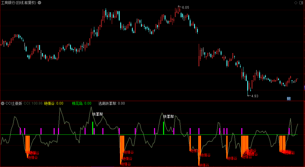 当满足条件绝情谷时,在CCI和-10位置之间画柱状线,宽度为0.9,0不为0则画空心柱.,COLOR0077FF