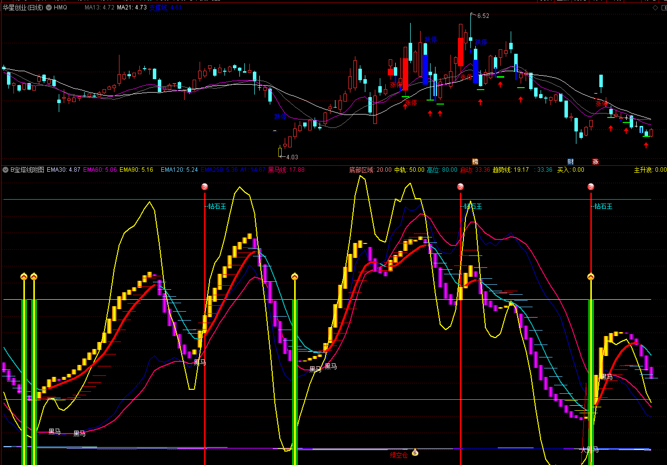 输出黑马线:A1的5日指数移动平均,线宽为2,COLOR6600FF