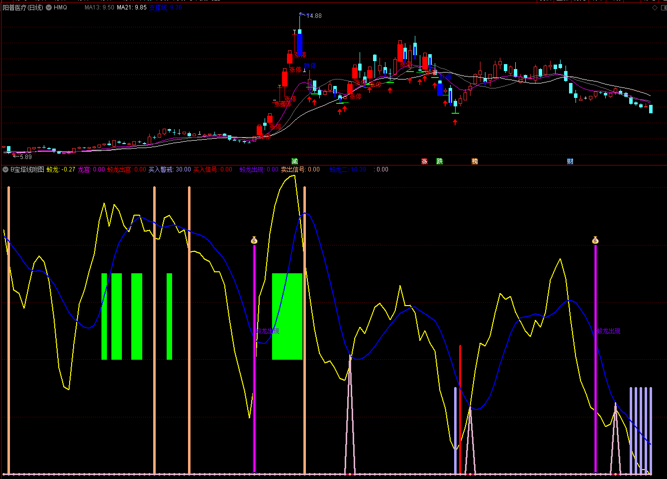 输出龙宫:如果蛟龙上穿蛟龙的10日简单移动平均AND蛟龙<=10,返回35,否则返回0,线宽为3,画洋红色