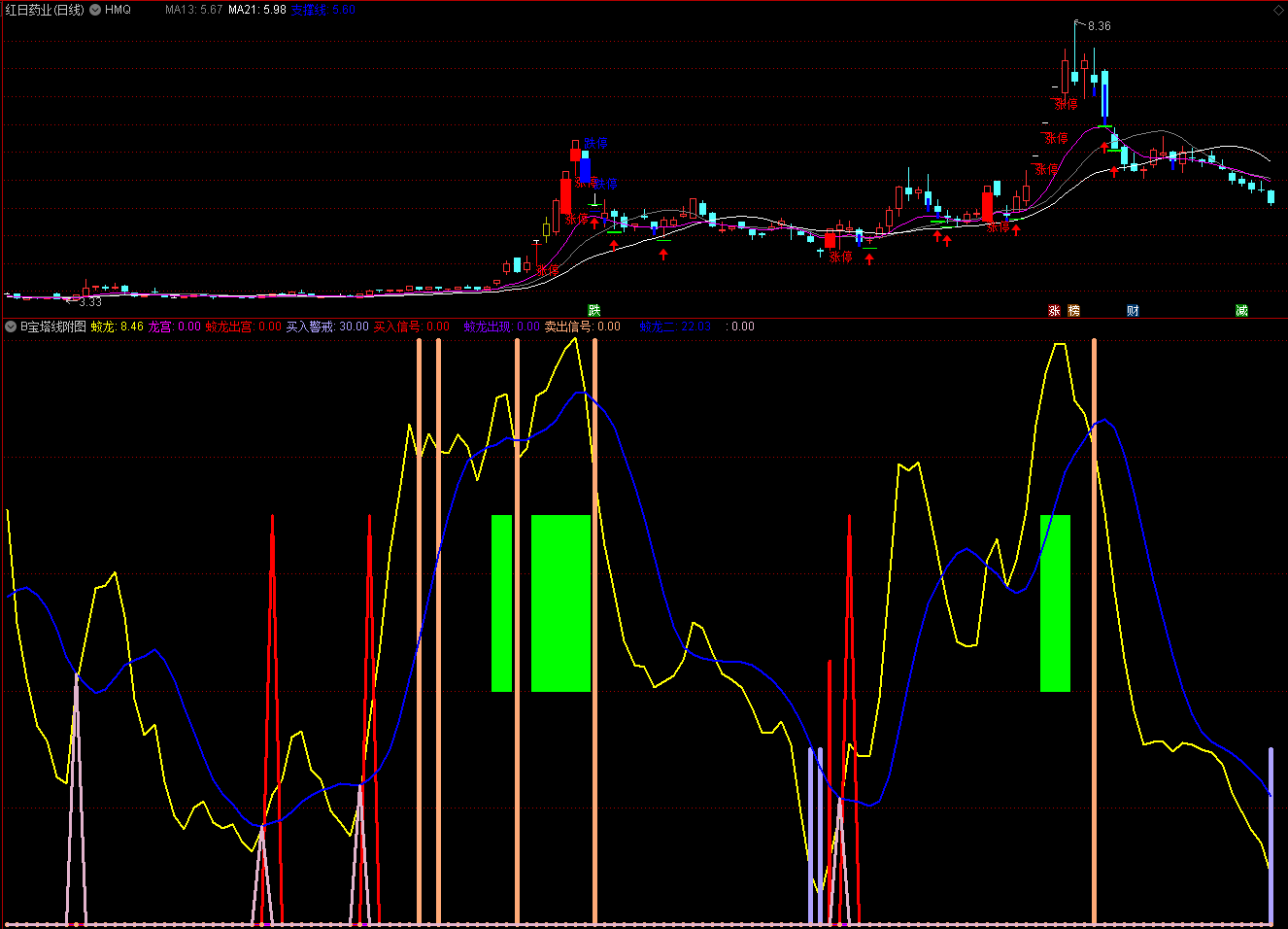 输出买入警戒:如果蛟龙<=10,返回30,否则返回0,STICK,COLORFFA2AE,线宽为5