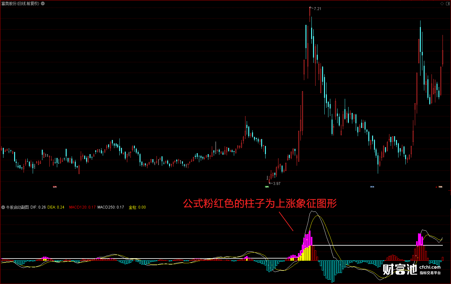 1、公式粉红色的柱子为上涨象征图形,越长上涨越勐,面积越大说明涨幅越大