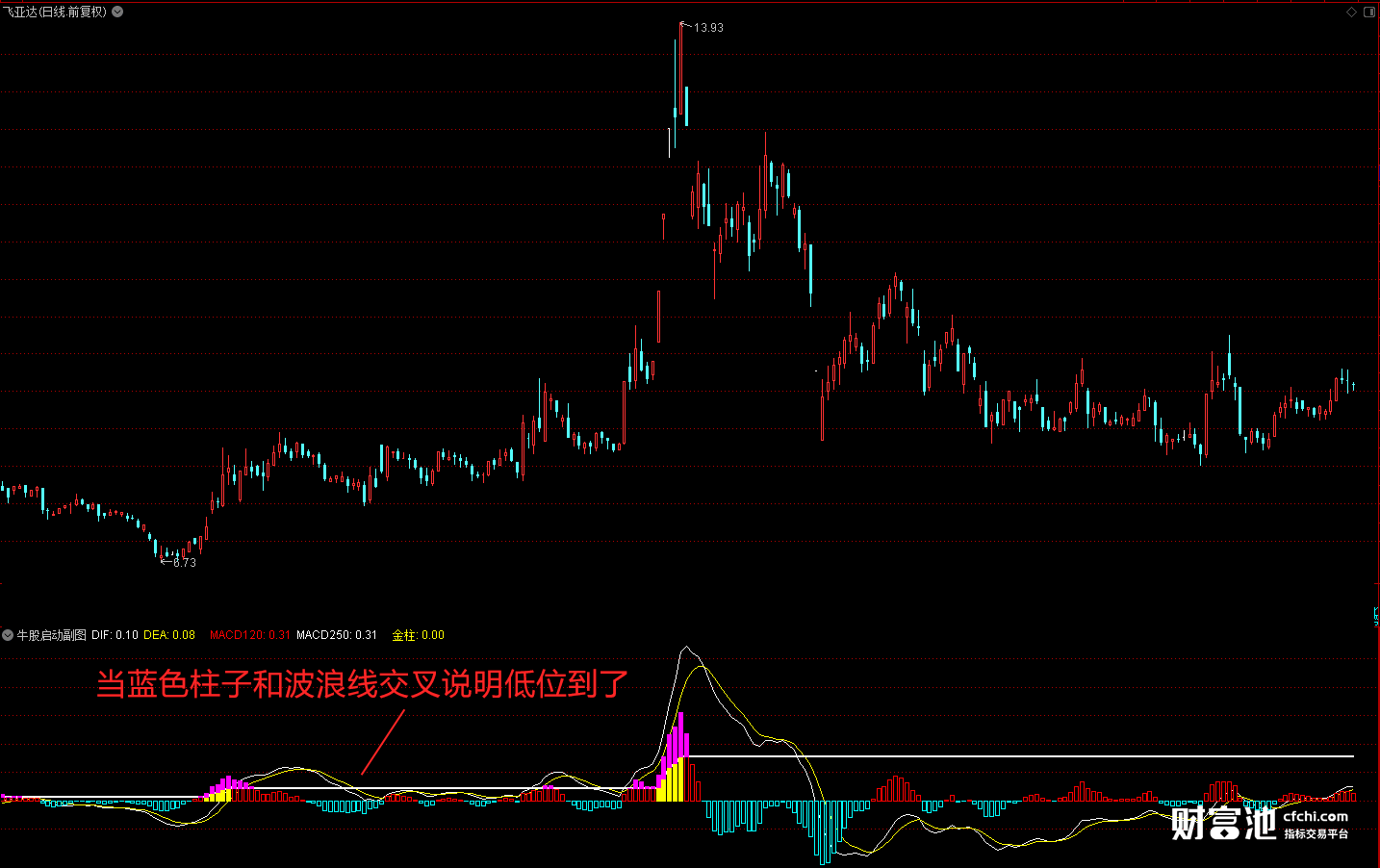 3、当蓝色柱子和波浪线交叉说明低位到了,这个时候可以考虑