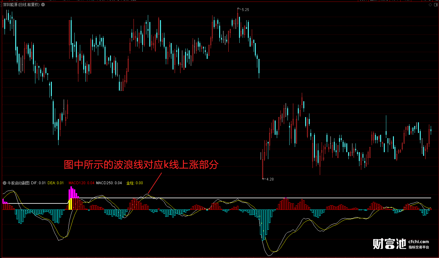 2、图中所示的波浪线对应k线上涨部分,让股民看图更加容易