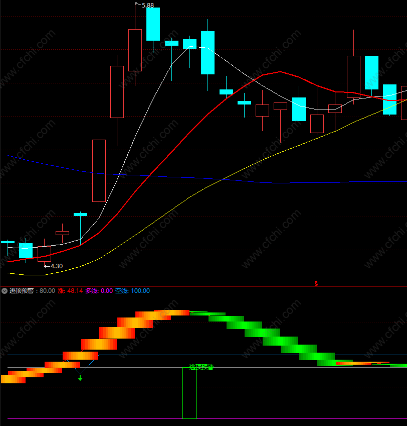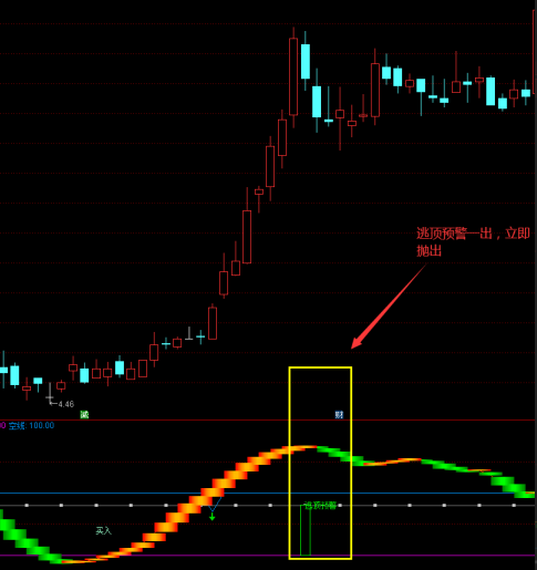 4、出现逃顶预警,快速抛出,后面转为绿线,开始下跌。