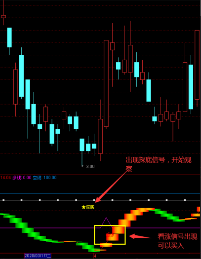 3、探底信号表示抄底预警,可以开始观察,出现看涨的信号,可以买入,表示后势为上涨趋势;