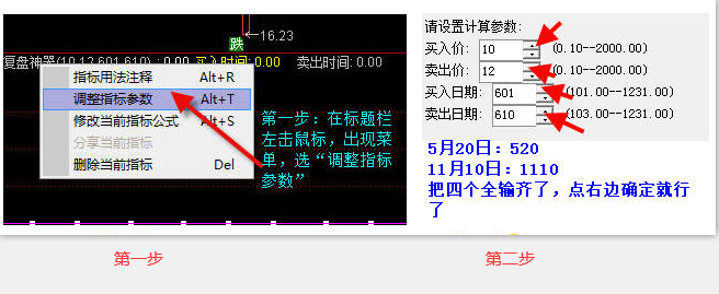 使用这个小指标时,只要在日线的指标参数中,输入下单日期,价格,出单日期和价格,就可以直接在对应日期位置标出相应价格,