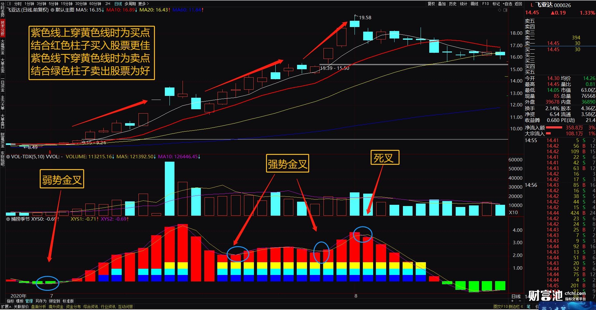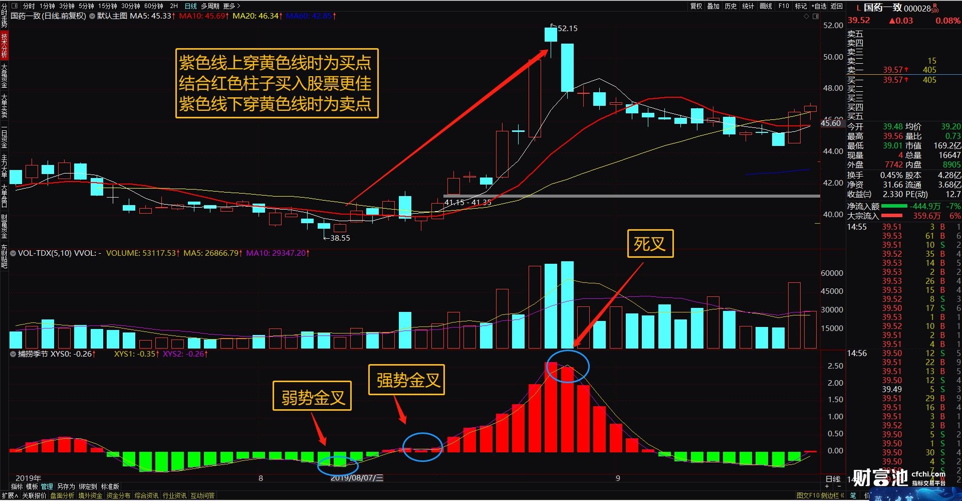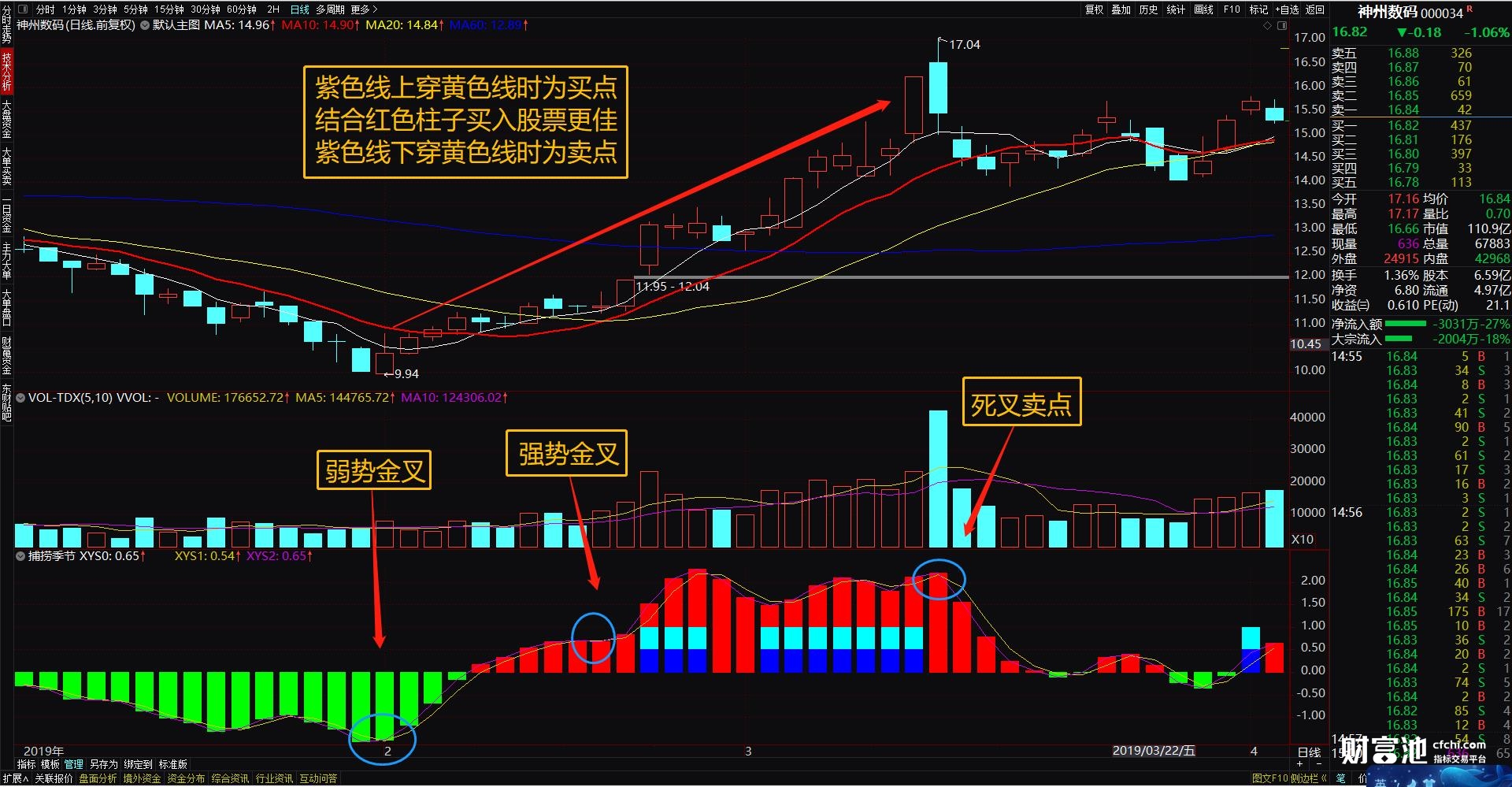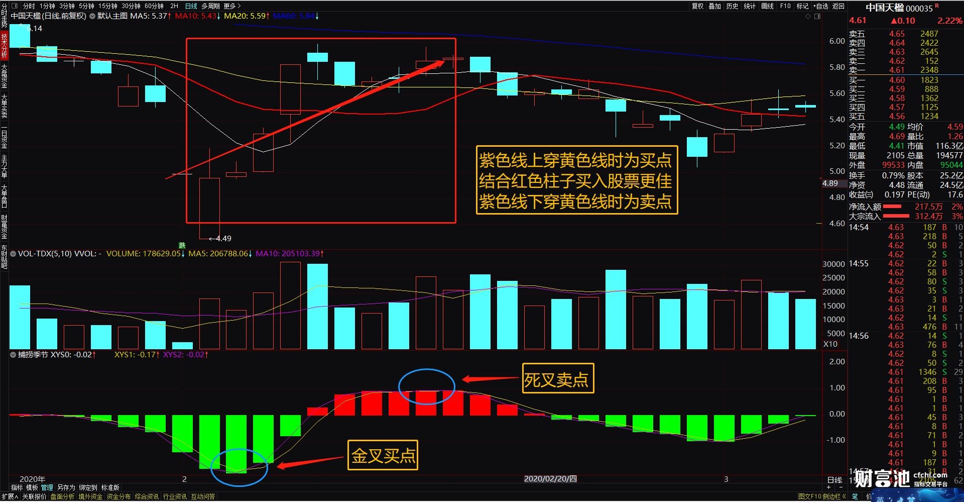 用紫线和黄线来显示处于一种短线买卖点状态:紫线上穿黄线为金叉,为短线买点;紫线下穿黄线为死叉,为短线卖点。一般情况下,金叉是波段的低点,死叉是波段的高点。从趋势上讲,分为涨势、跌势、方向不明(横盘)三种状态。