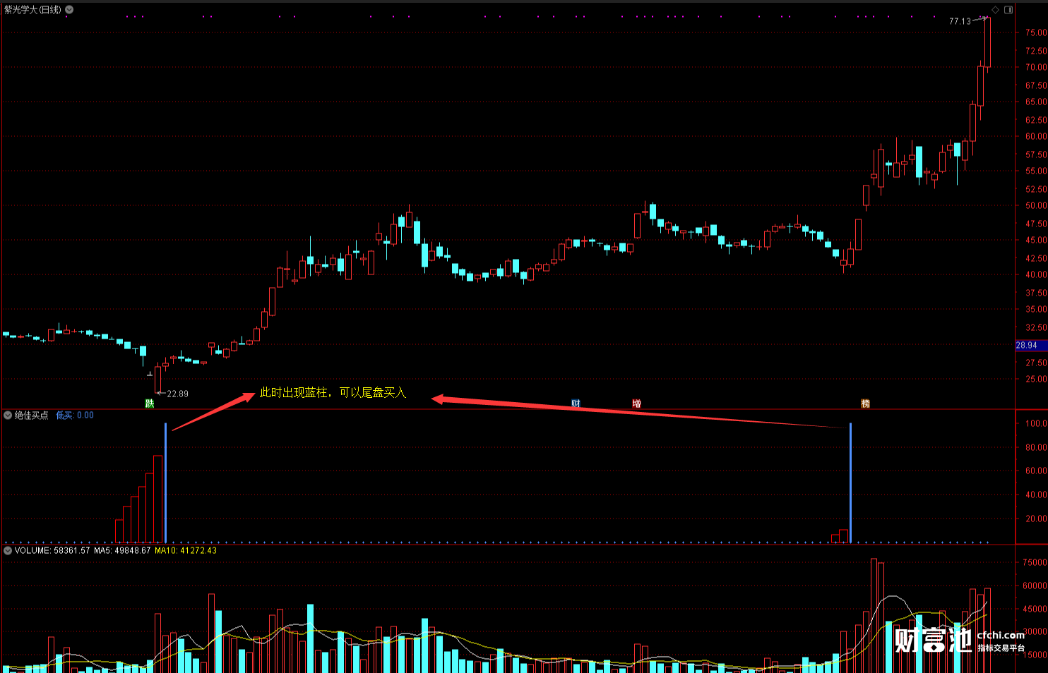 出现蓝柱,当天尾盘买入,第二日逢高卖出,也可以多拿几天多赚一点再出。成功率还是很不错的,且风险很小,喜欢稳的朋友,可以参考使用。